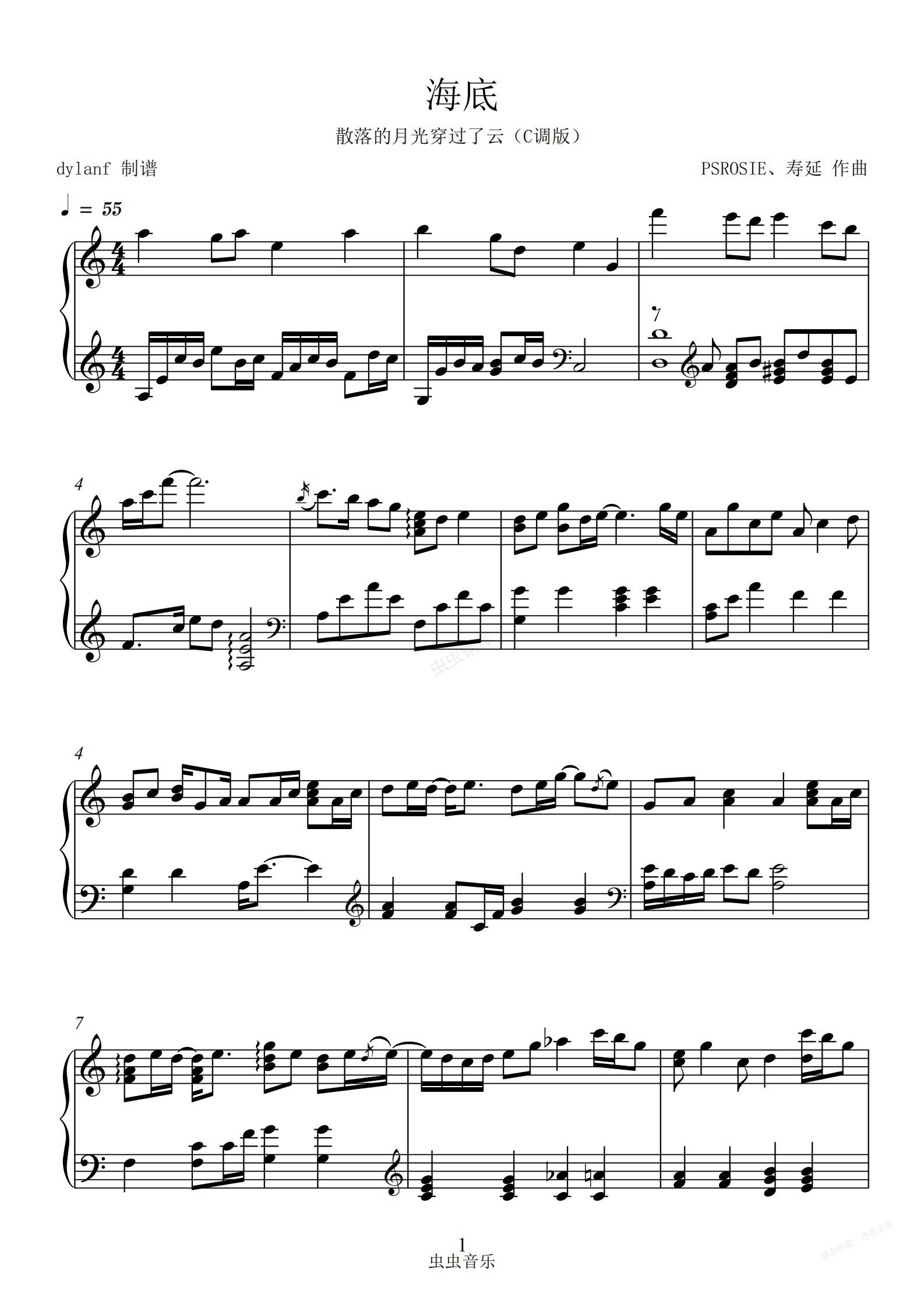 钢琴谱:C调易弹 海底(钢琴版)唯美好听