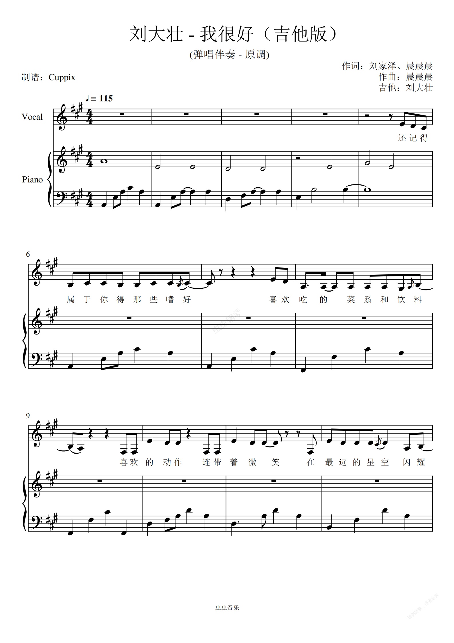 钢琴谱:刘大壮 - 我很好(吉他版)弹唱伴奏附词 高度还原
