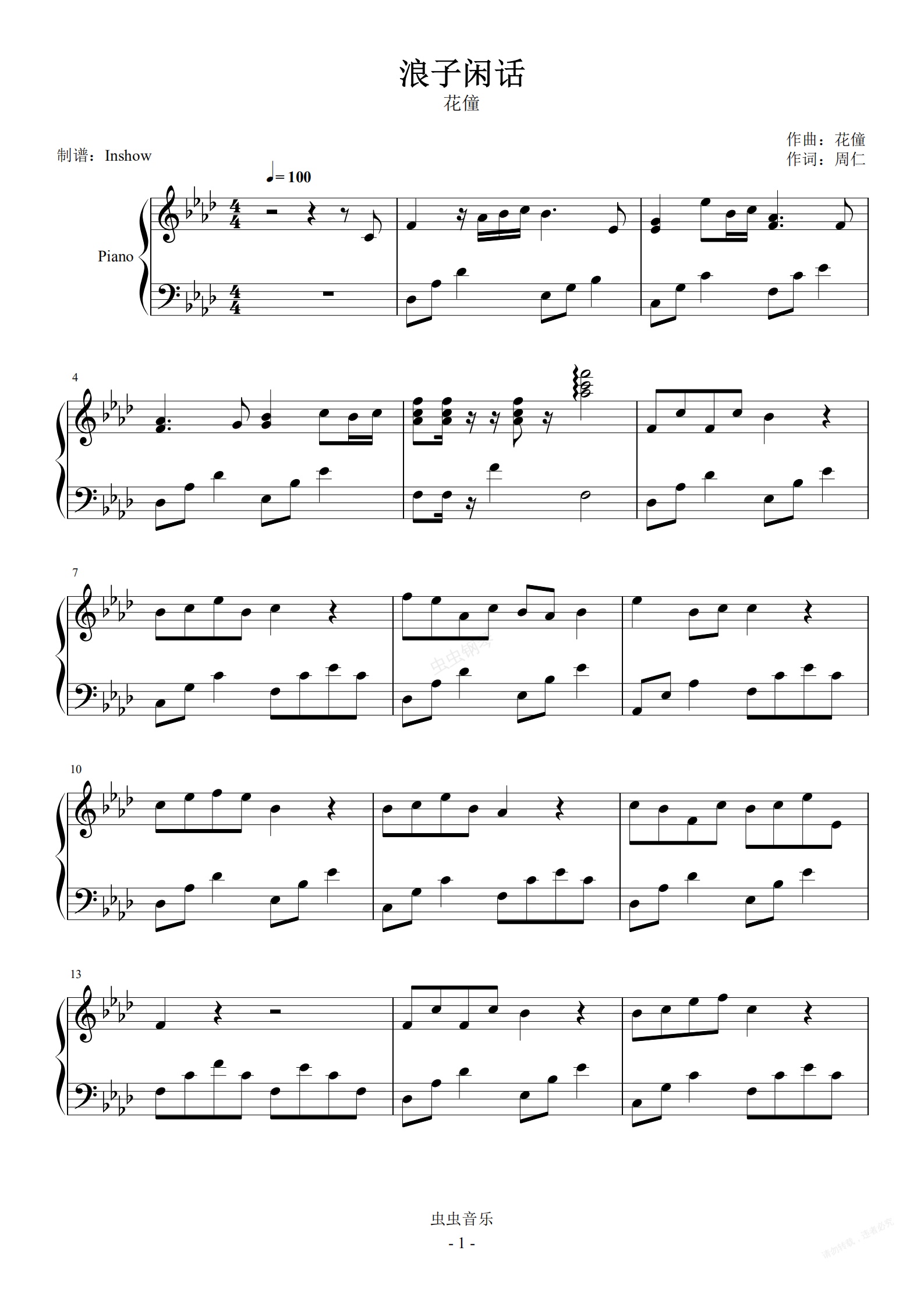 钢琴谱:浪子闲话【独奏】- 花僮 -