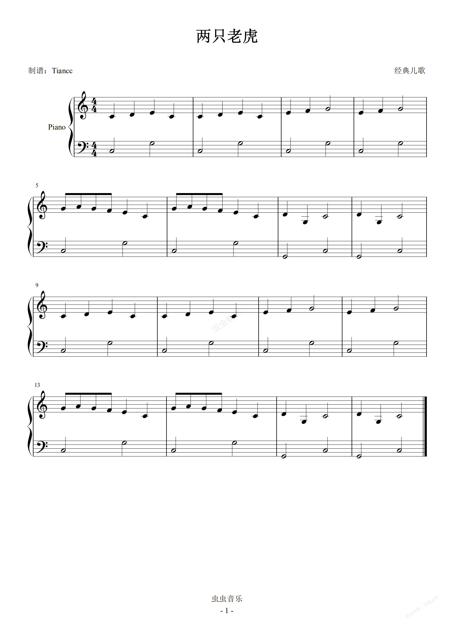 钢琴谱:《两只老虎》小汤2难度