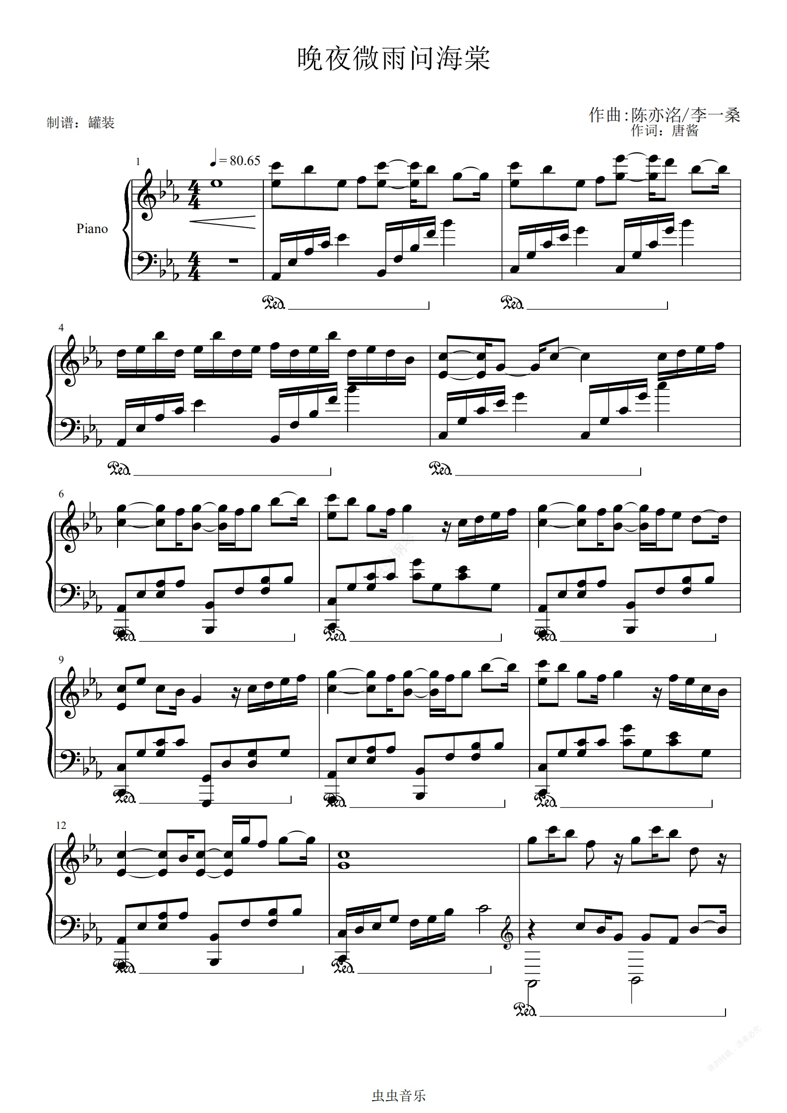 钢琴谱:晚夜微雨问海棠(多声部还原版)