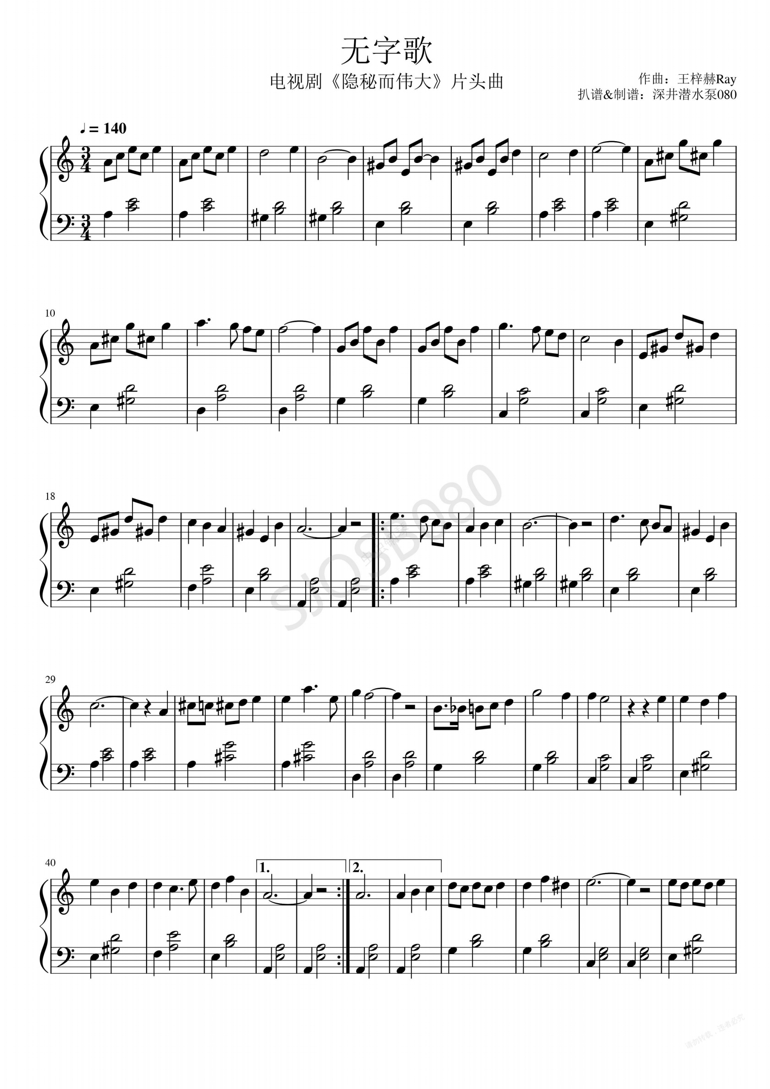 钢琴谱:无字歌-王梓赫Ray(电视剧隐秘而伟大片头曲)