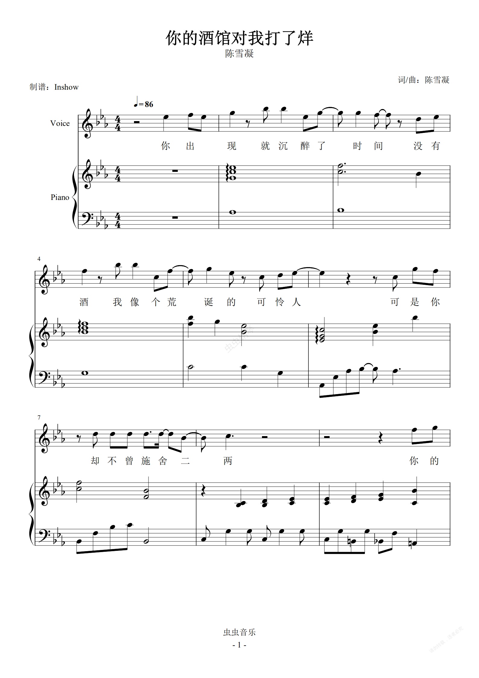 钢琴谱:你的酒馆对我打了烊【弹唱】- 陈雪凝 -