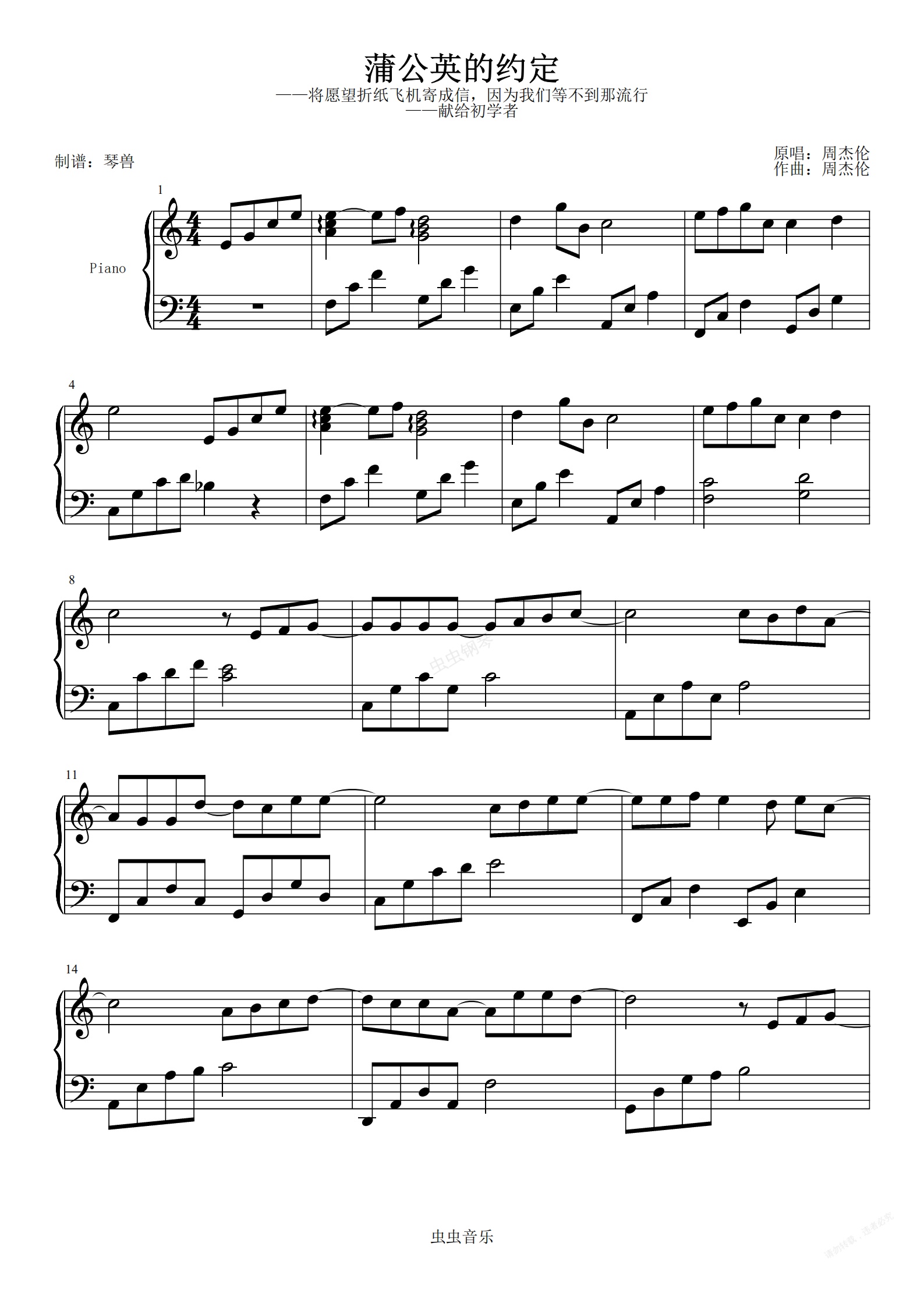 钢琴谱:蒲公英的约定-周杰伦(琴兽简单版)