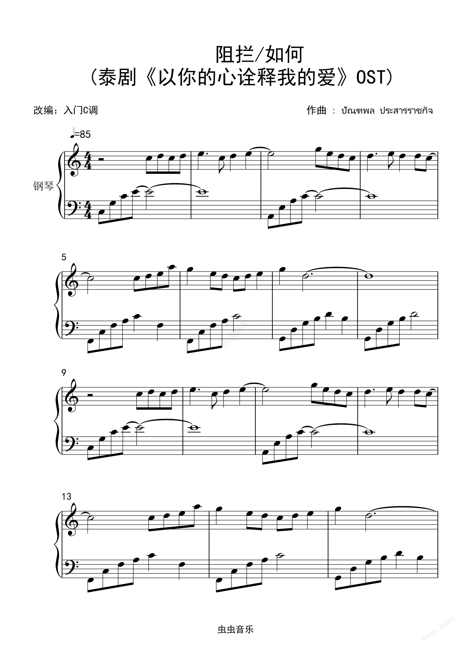 钢琴谱:阻拦/如何 (泰剧《以你的心诠释我的爱》)C调抒情简单版