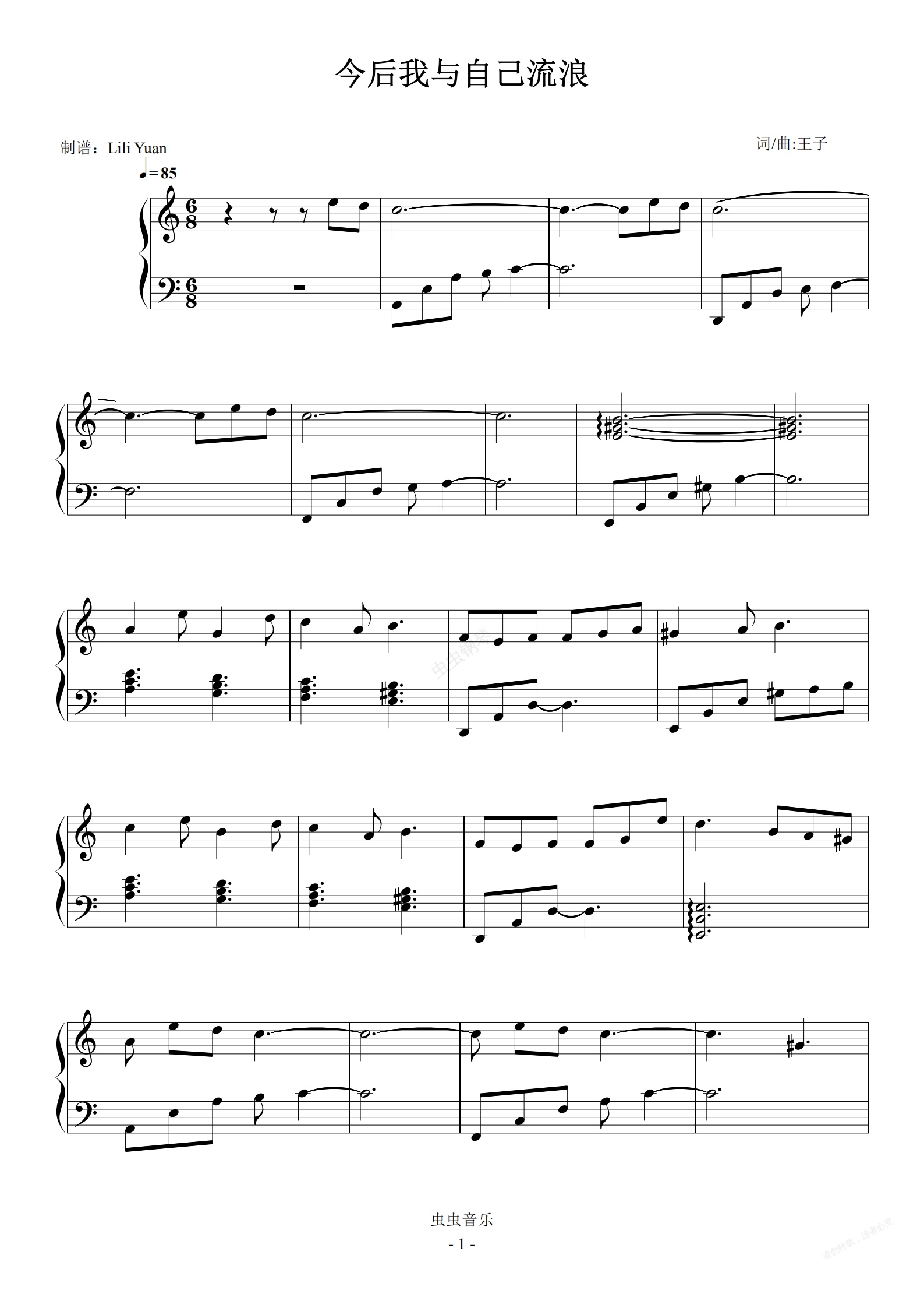 钢琴谱:今后我与自己流浪 (《哪吒之魔童降世》电影片尾曲) C调 原唱版 (LY)