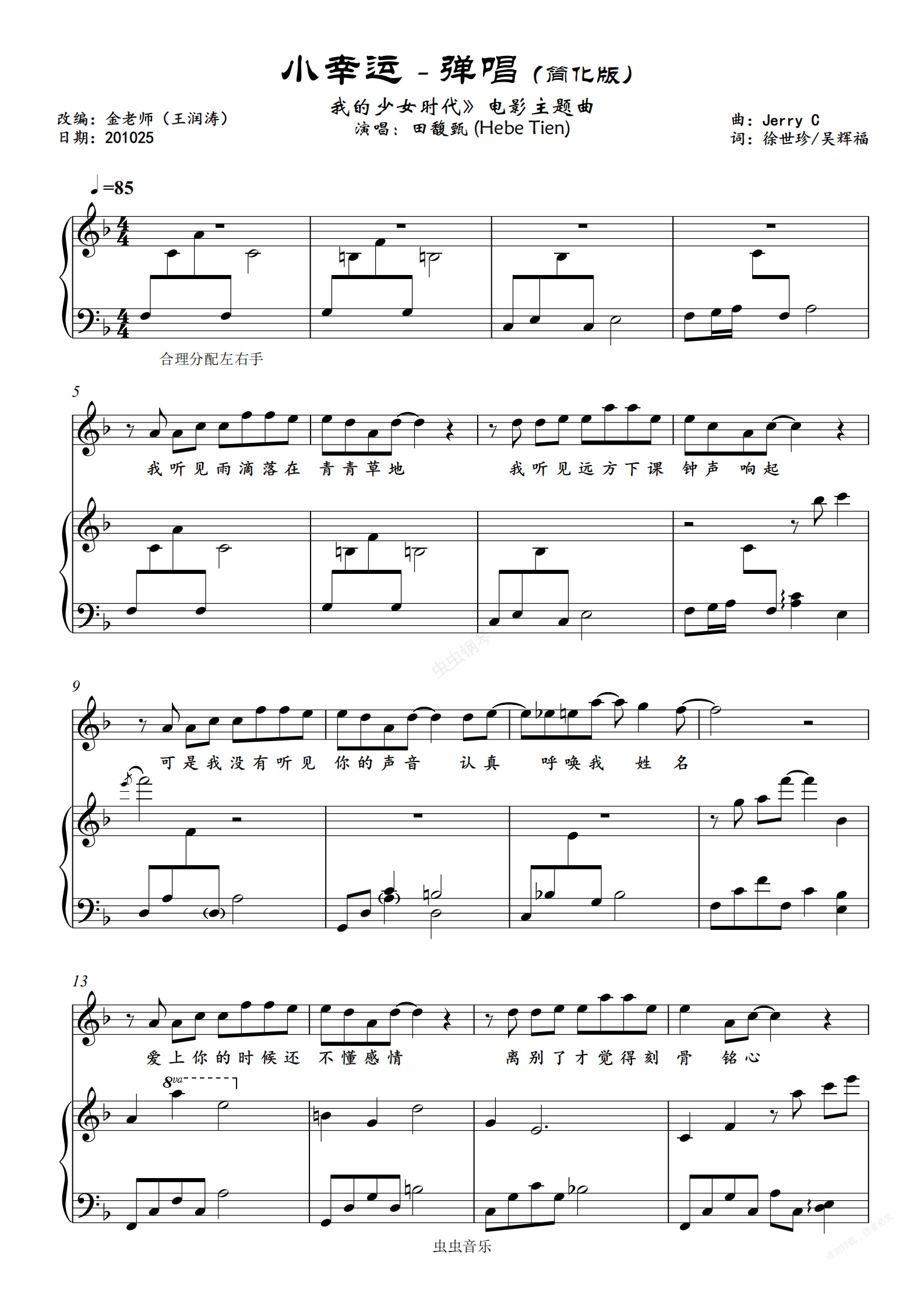 钢琴谱:小幸运 (《我的少女时代》电影主题曲)-金老师简化弹唱谱