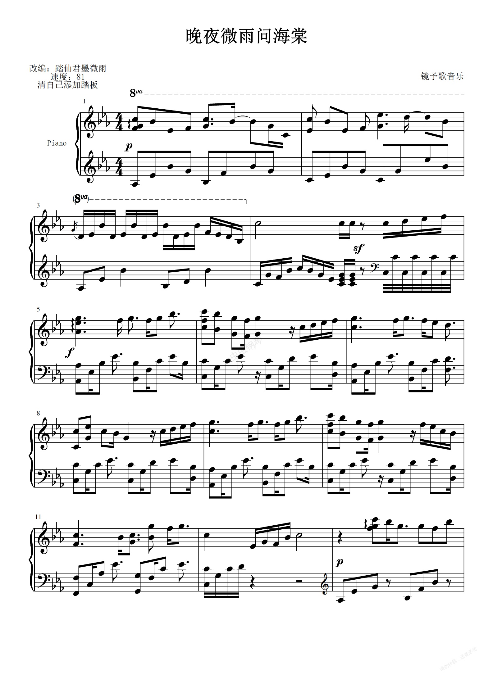 钢琴谱:晚夜微雨问海棠-部分版