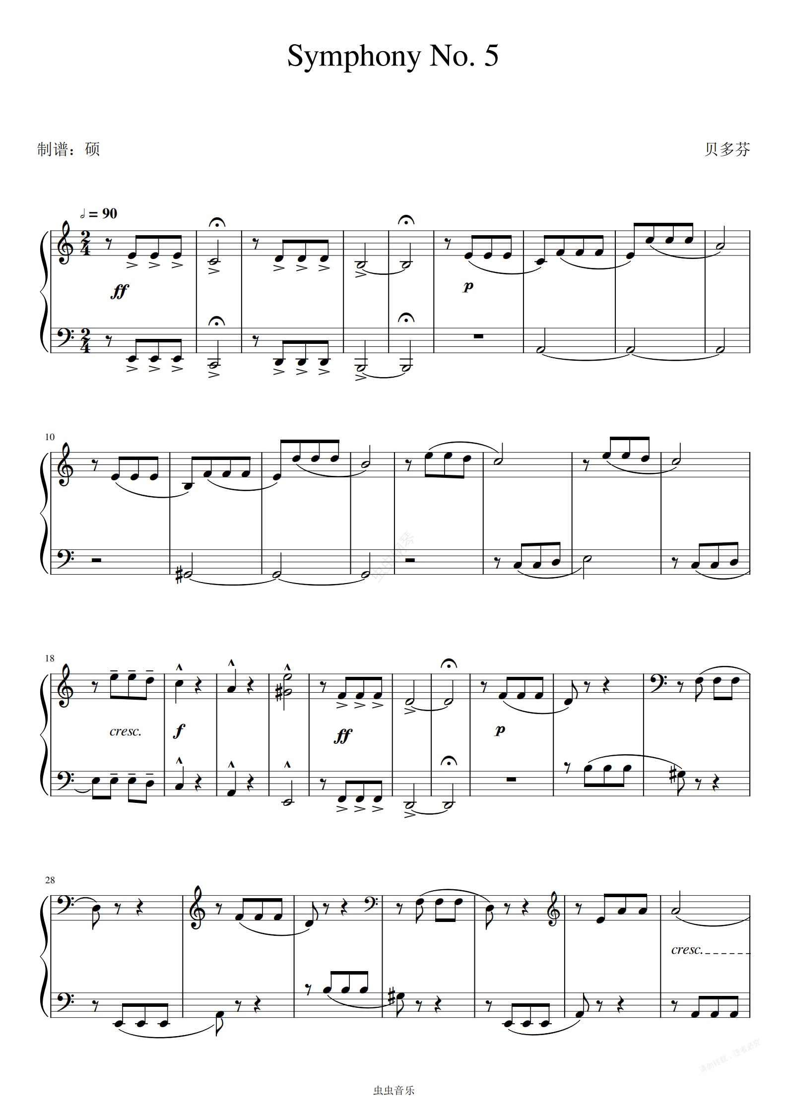 钢琴谱:Symphony No. 5 (贝多芬交响曲第五乐章)简单的钢琴版