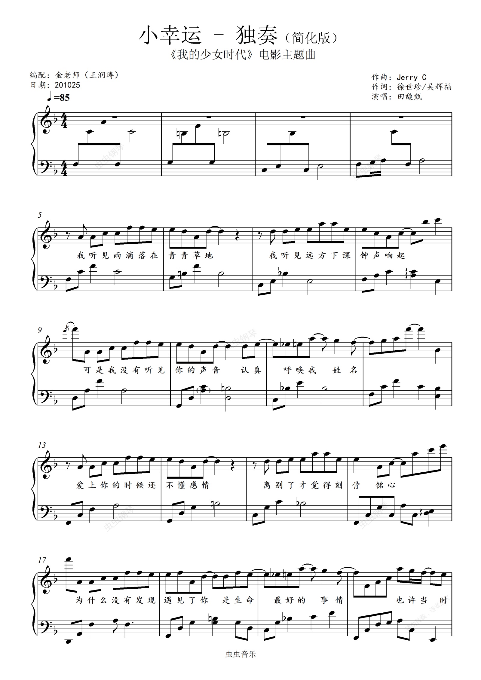 钢琴谱:小幸运 (《我的少女时代》电影主题曲)-金老师简化独奏谱