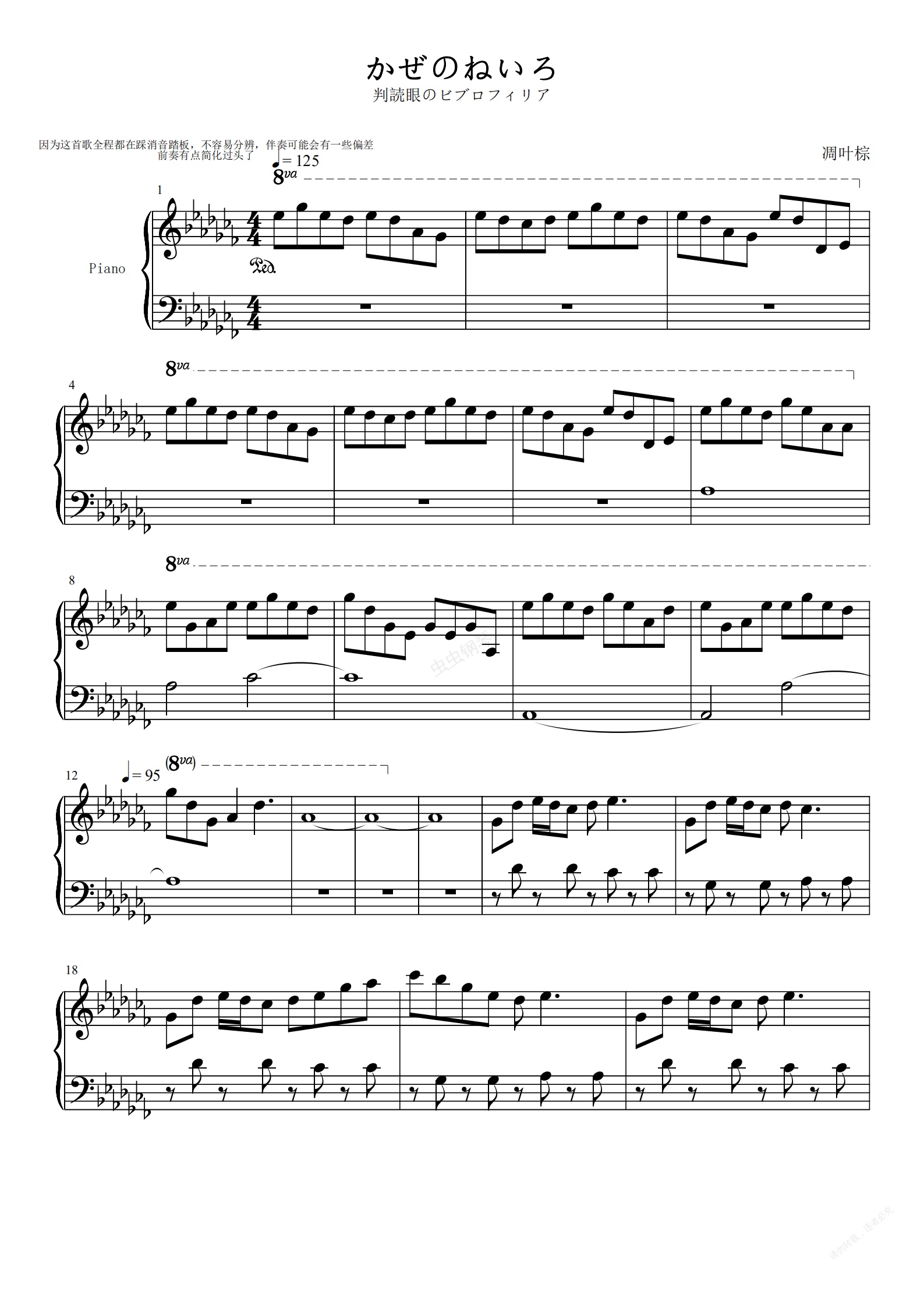 钢琴谱:【东方铃奈庵】かぜのねいろ {判読眼のビブロフィリア} -凋叶棕