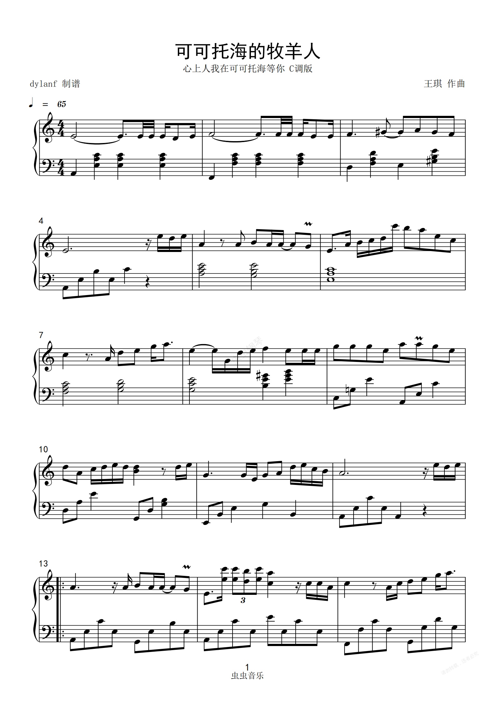 钢琴谱:C调版 可可托海的牧羊人(钢琴版)