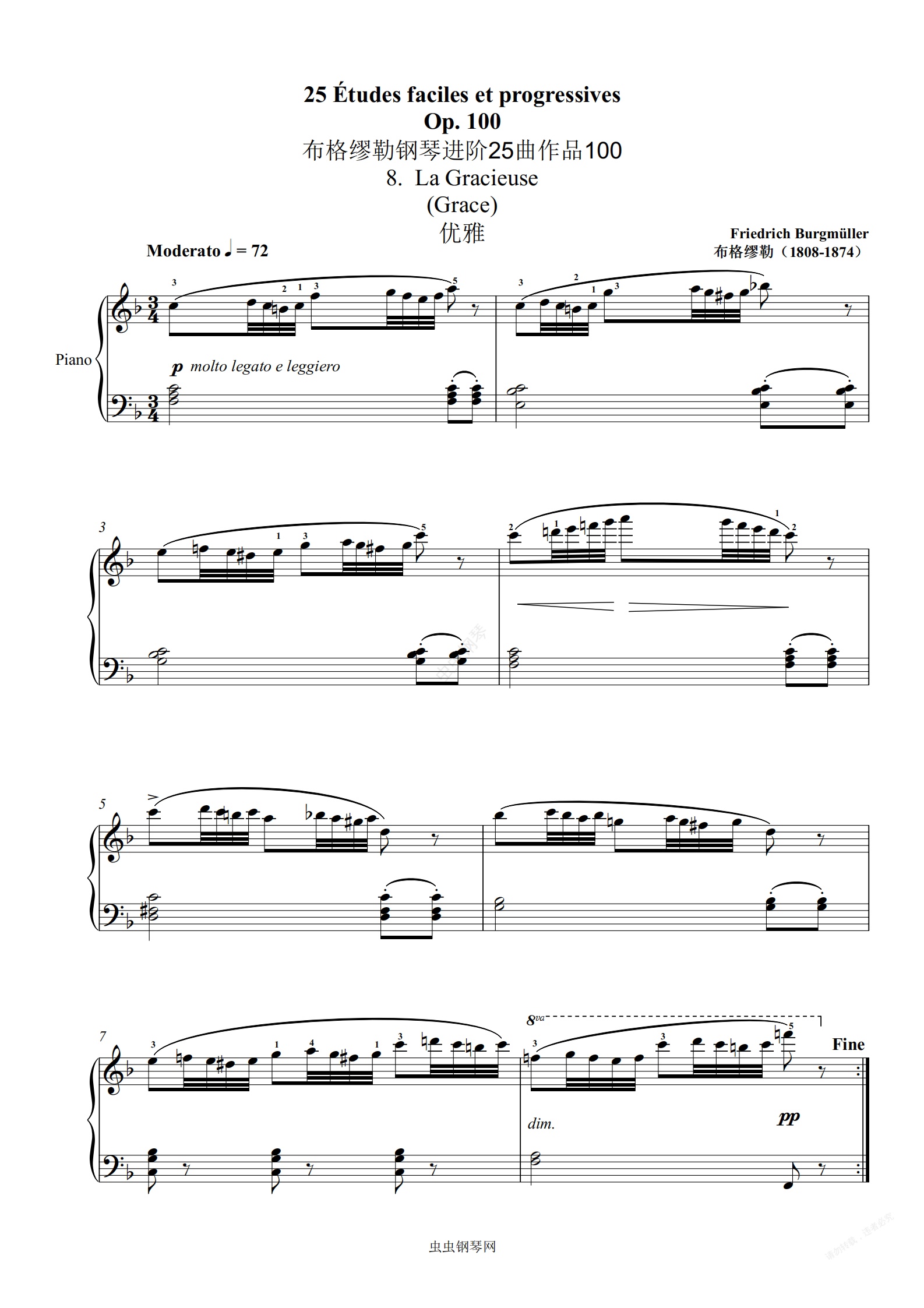 钢琴谱:【初学者】布格缪勒25首钢琴进阶练习曲 Op. 100 第八首 优雅