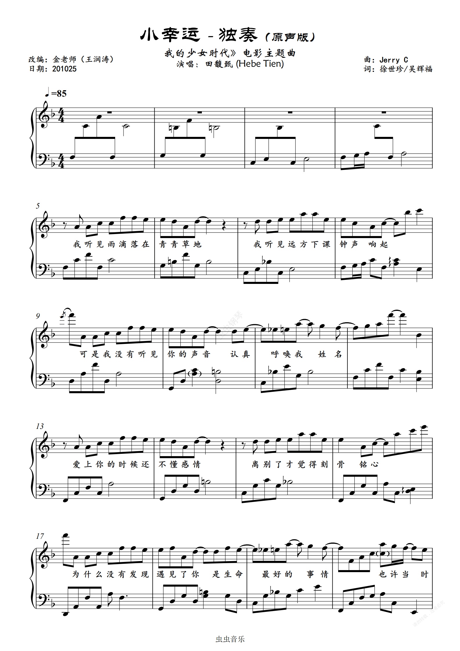 钢琴谱:小幸运 (《我的少女时代》电影主题曲)-金老师原声独奏谱