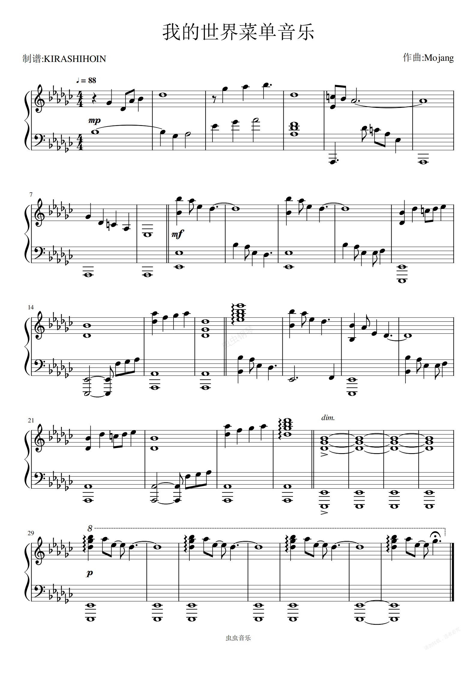 钢琴谱:我的世界主菜单背景音乐-Beginning
