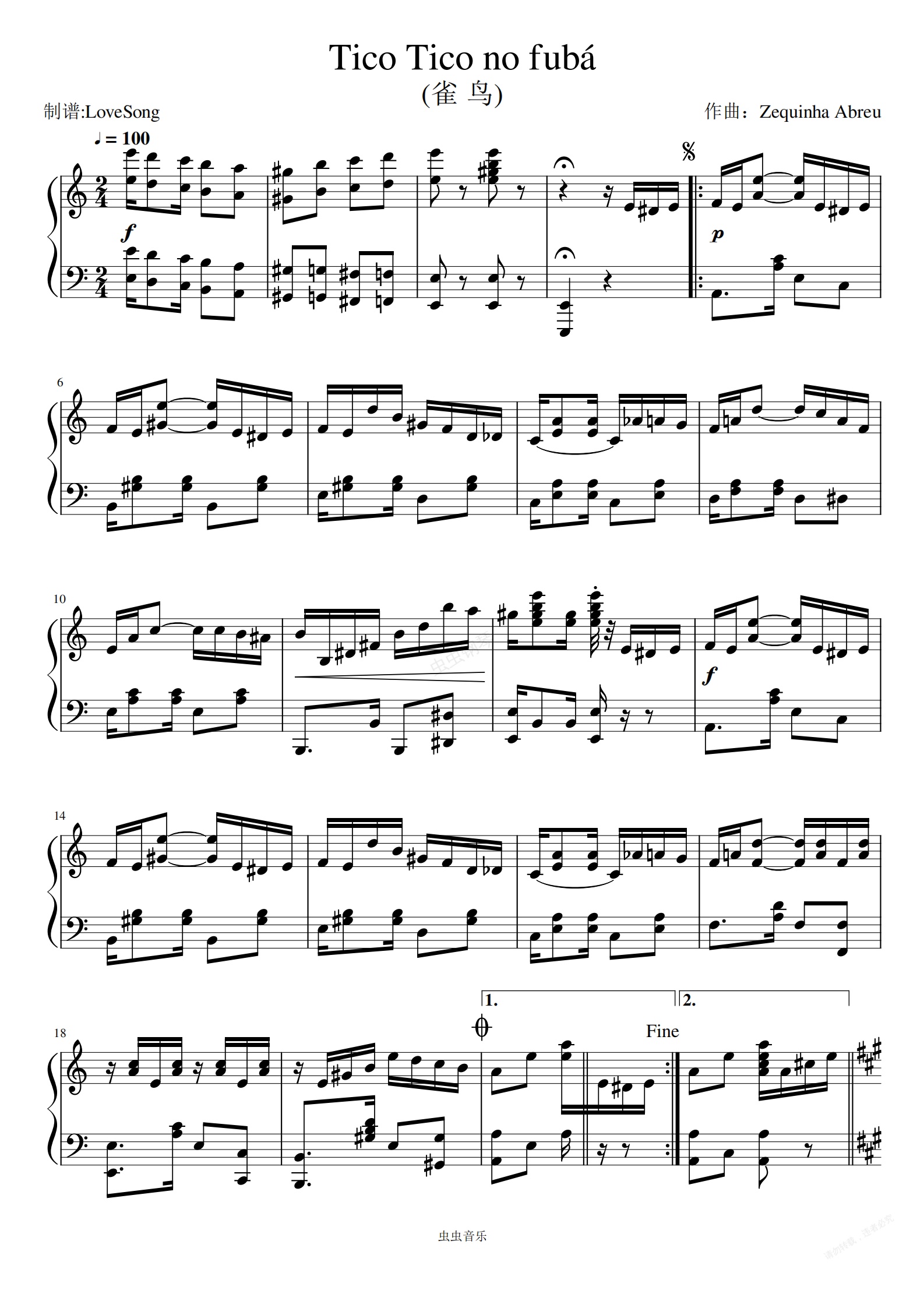 钢琴谱:Tico-Tico no fubá 雀鸟 钢琴谱 玉米粉上的雀鸟