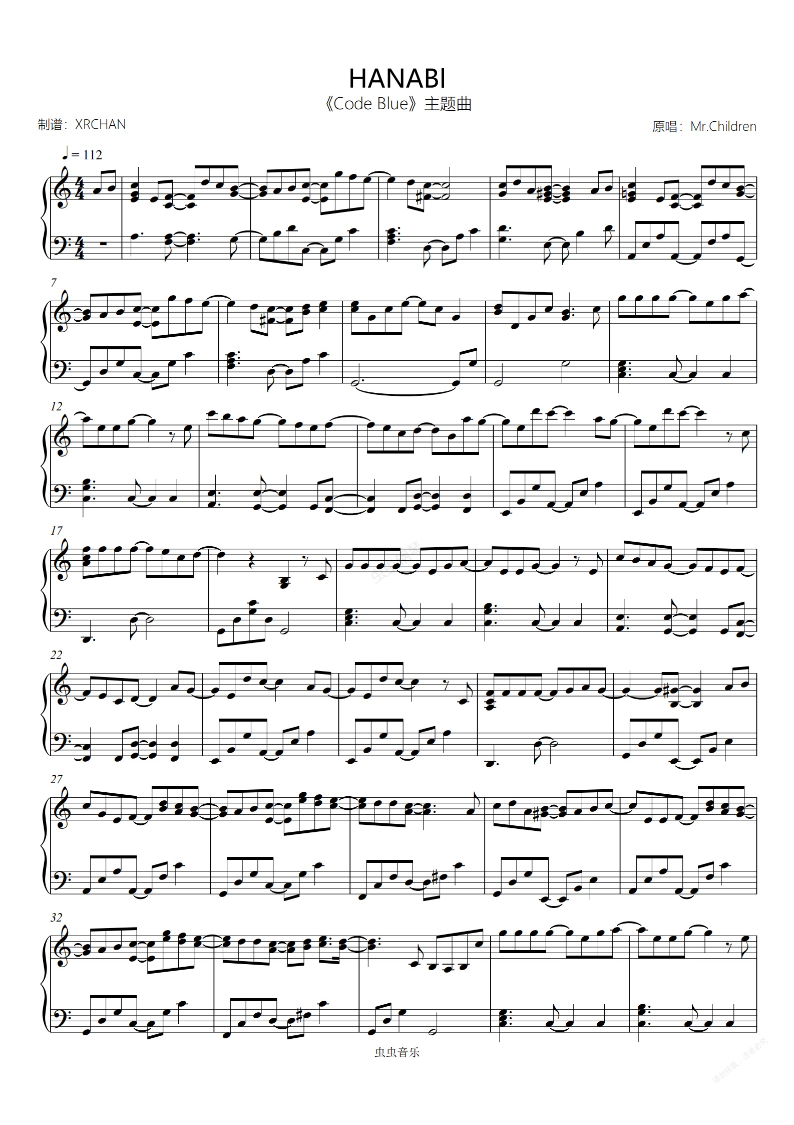 钢琴谱:HANABI 日剧《Code Blue》主题曲 C调 初级