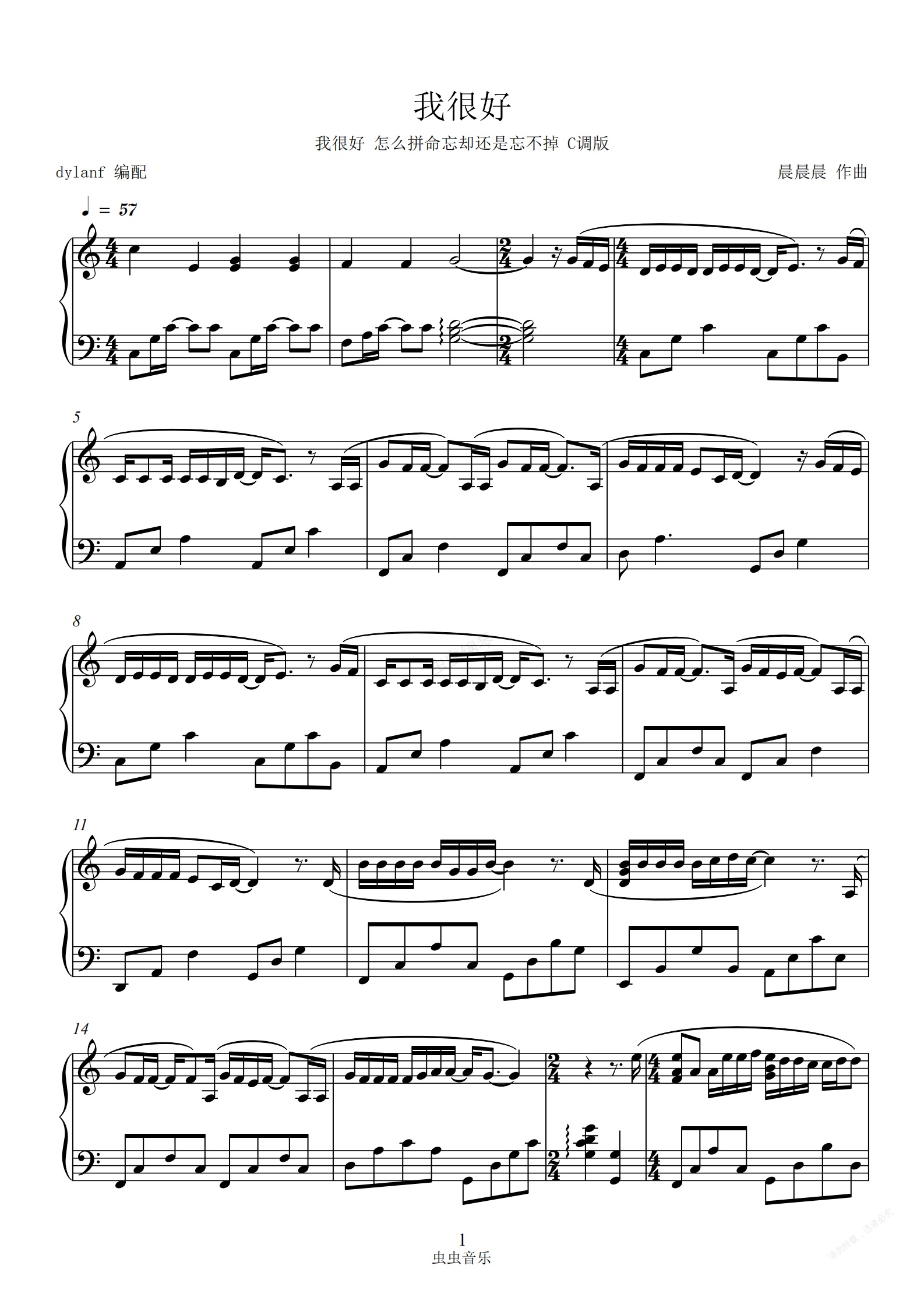 钢琴谱:C调 我很好(钢琴版)刘大壮