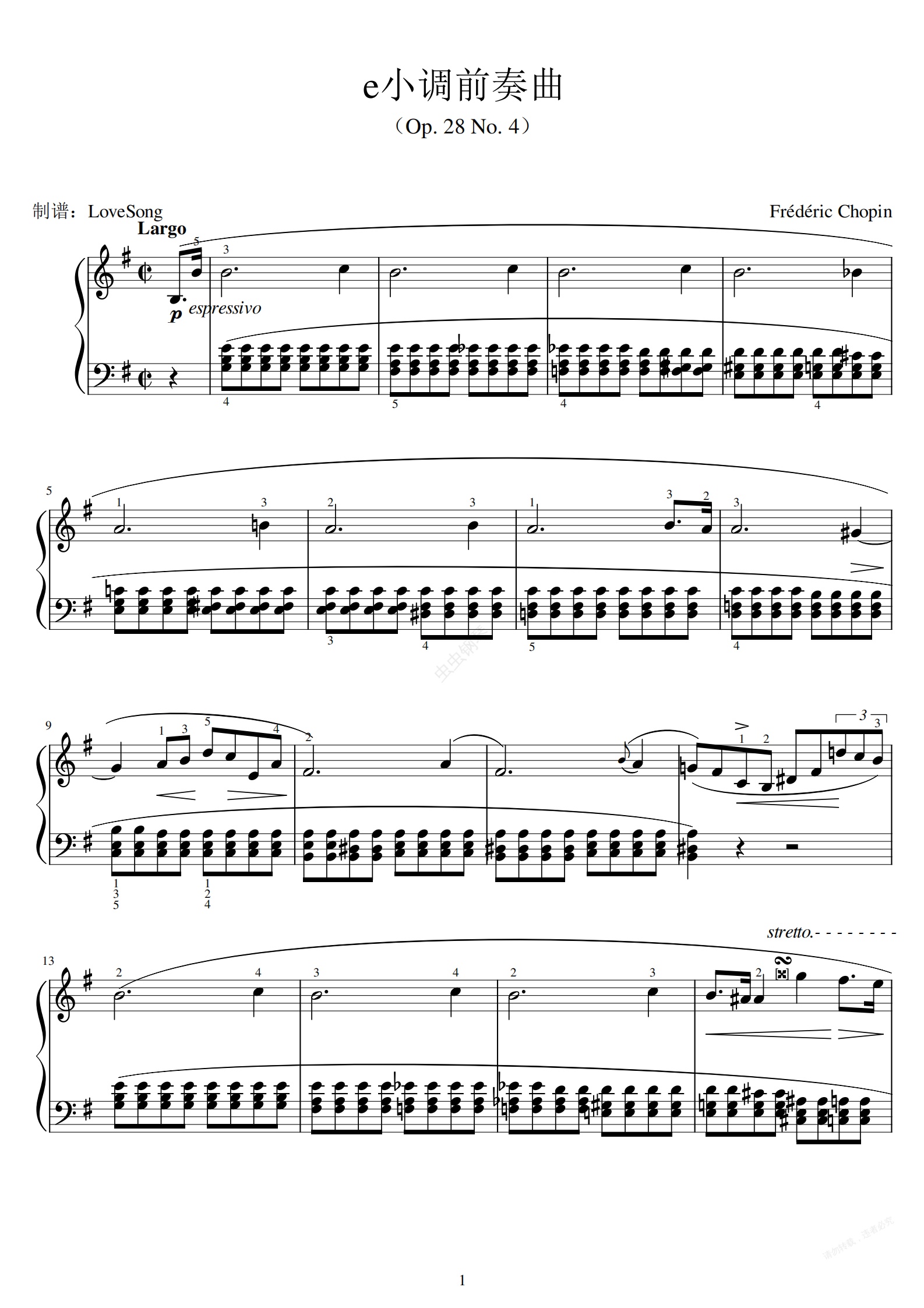 钢琴谱:肖邦 e小调前奏曲 钢琴谱带指法OP28 NO4