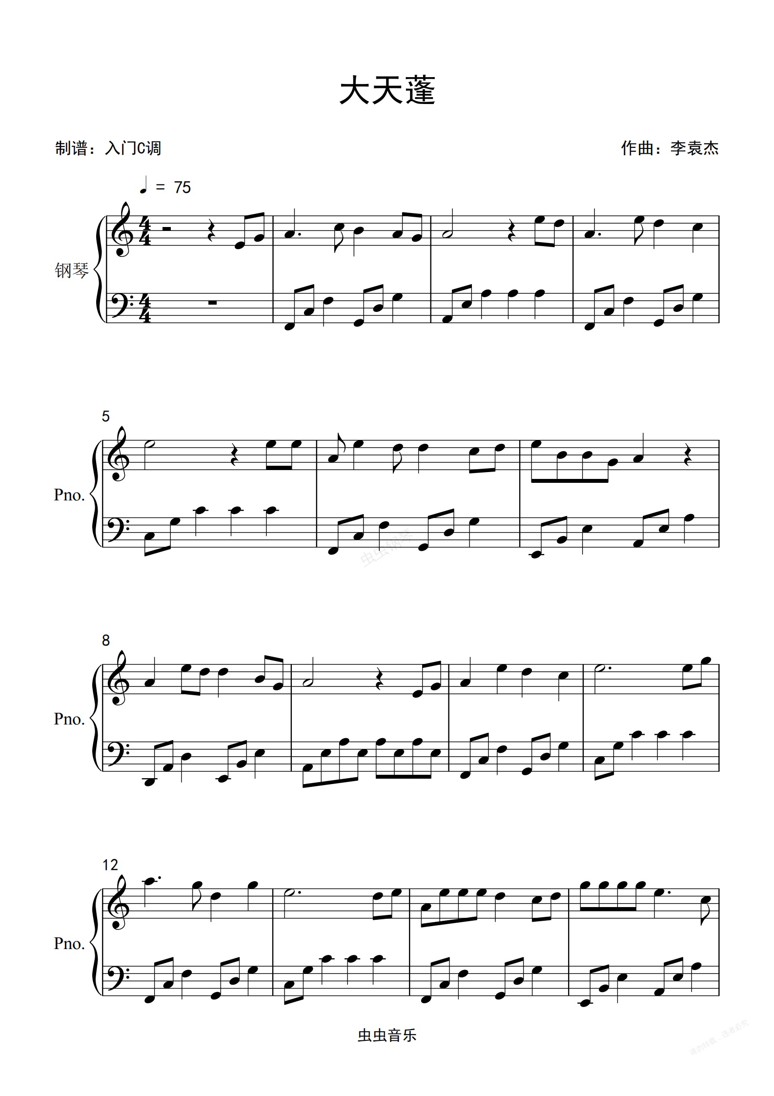 钢琴谱:李袁杰《大天蓬》C调简单版