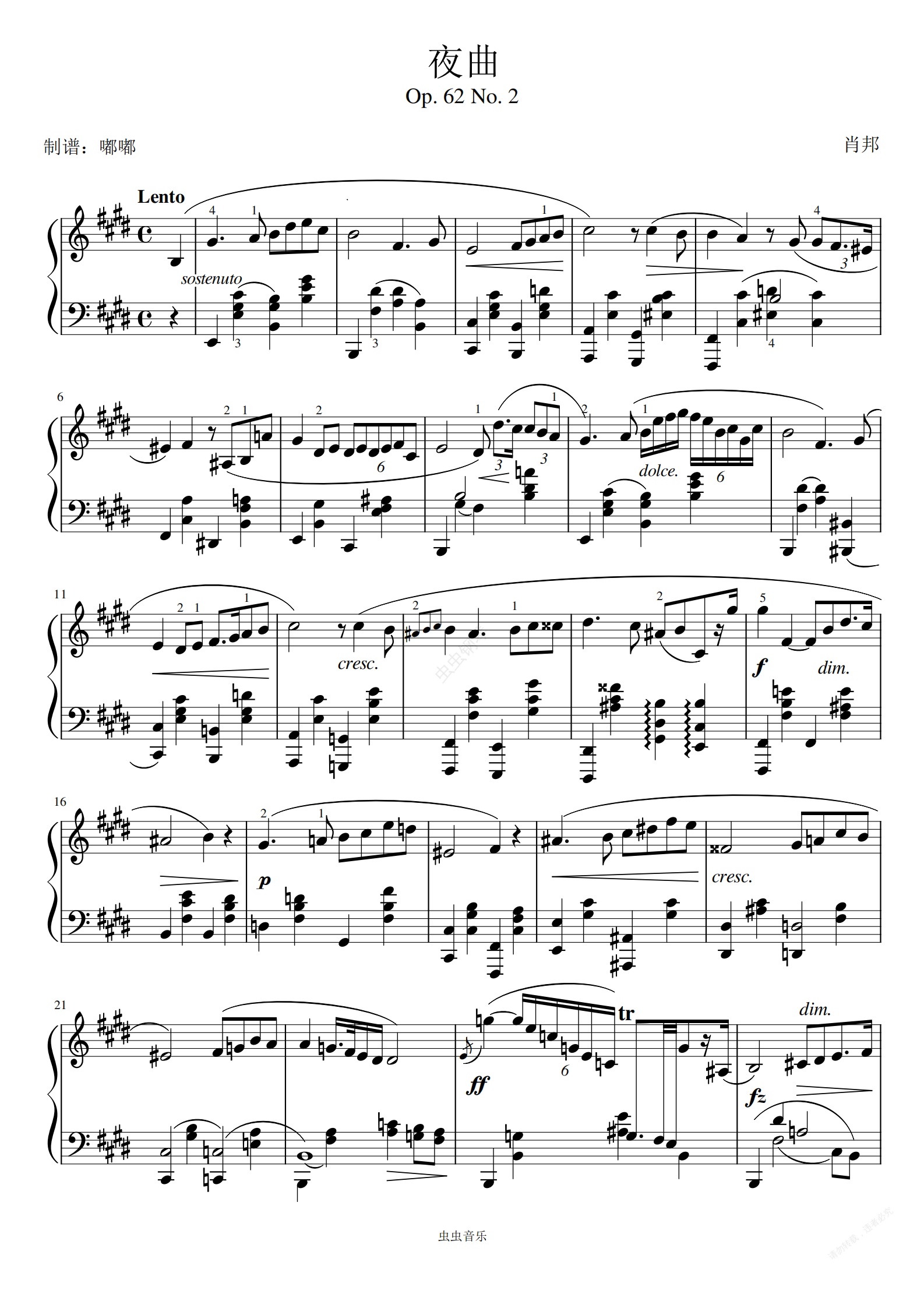钢琴谱:肖邦《夜曲》Op. 62 No. 2(带指法)