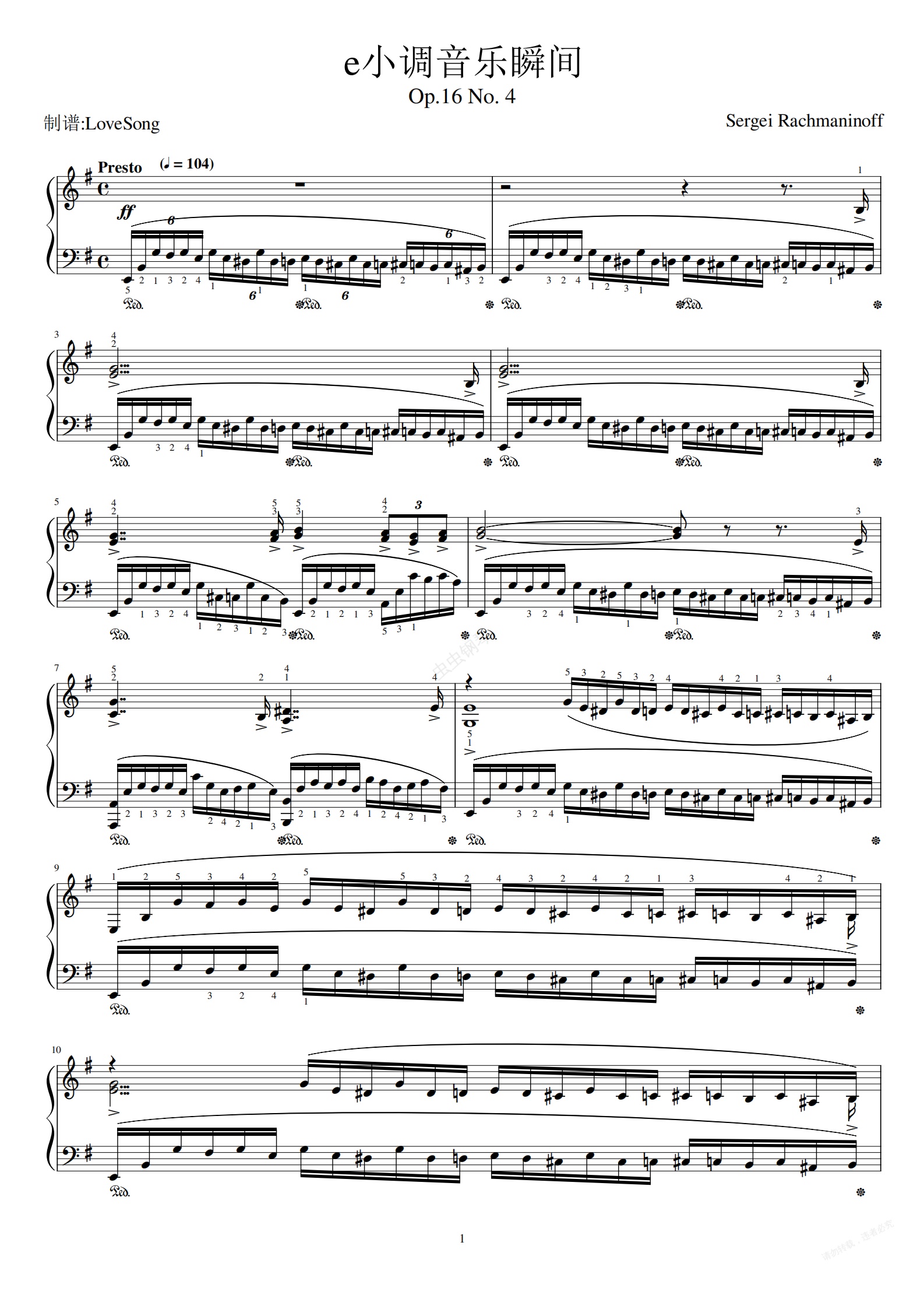 钢琴谱:拉赫玛尼诺夫 e小调音乐瞬间钢琴谱带指法原版