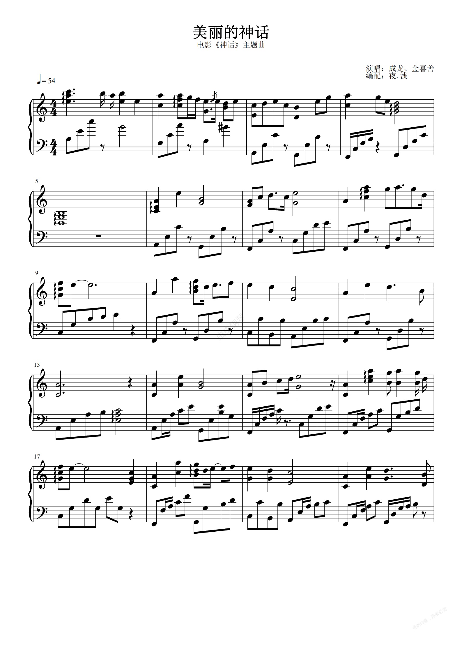 钢琴谱:《美丽的神话》原版钢琴谱~成龙金喜善