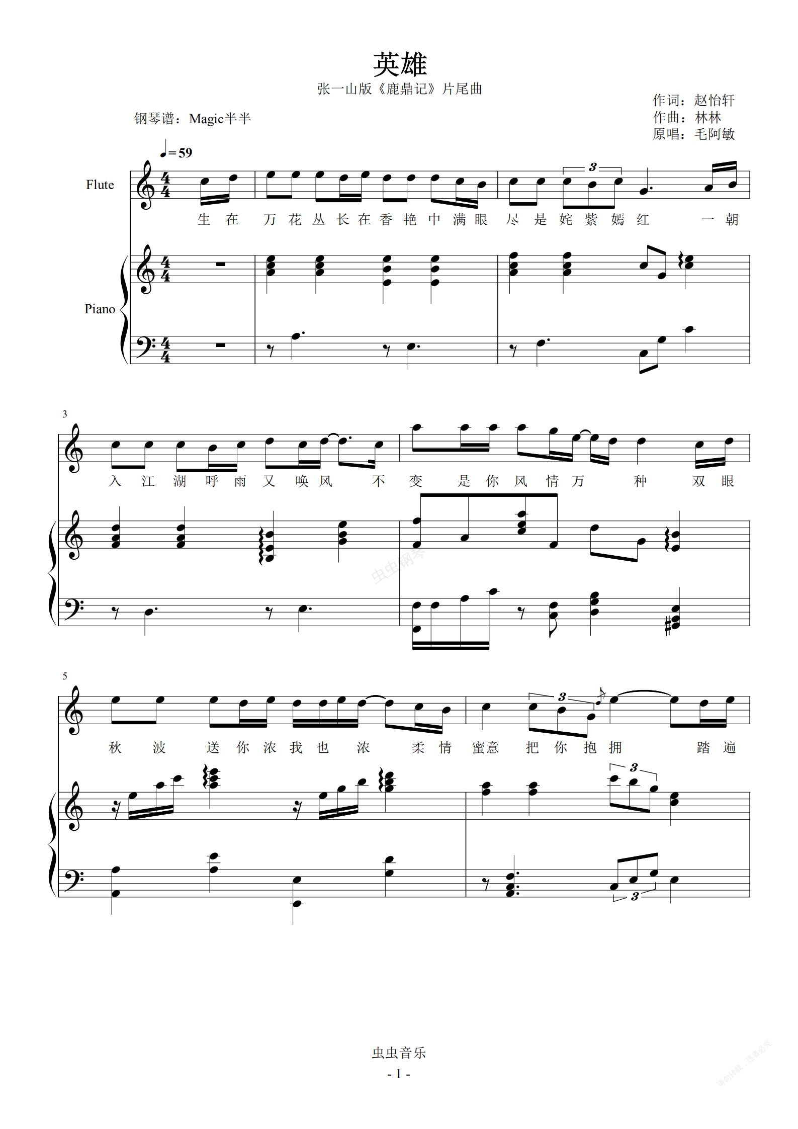 《鹿鼎记》(张一山、唐艺昕版)的片尾曲。2020年12月1日央视8播出了该剧大结局,剧末一首《英雄》尽显江湖气,歌词也高度提炼了整个故事。由于此剧开播后评分走低,这首作品也易被不少人错过。本曲谱中,钢琴伴奏基本遵循原曲和弦走向、并按个人理解编配织体,歌唱部分用Flute音色来表现。(未加延音踏板效果,弹奏时可根据各自喜好适当添加处理,效果可能更佳~)