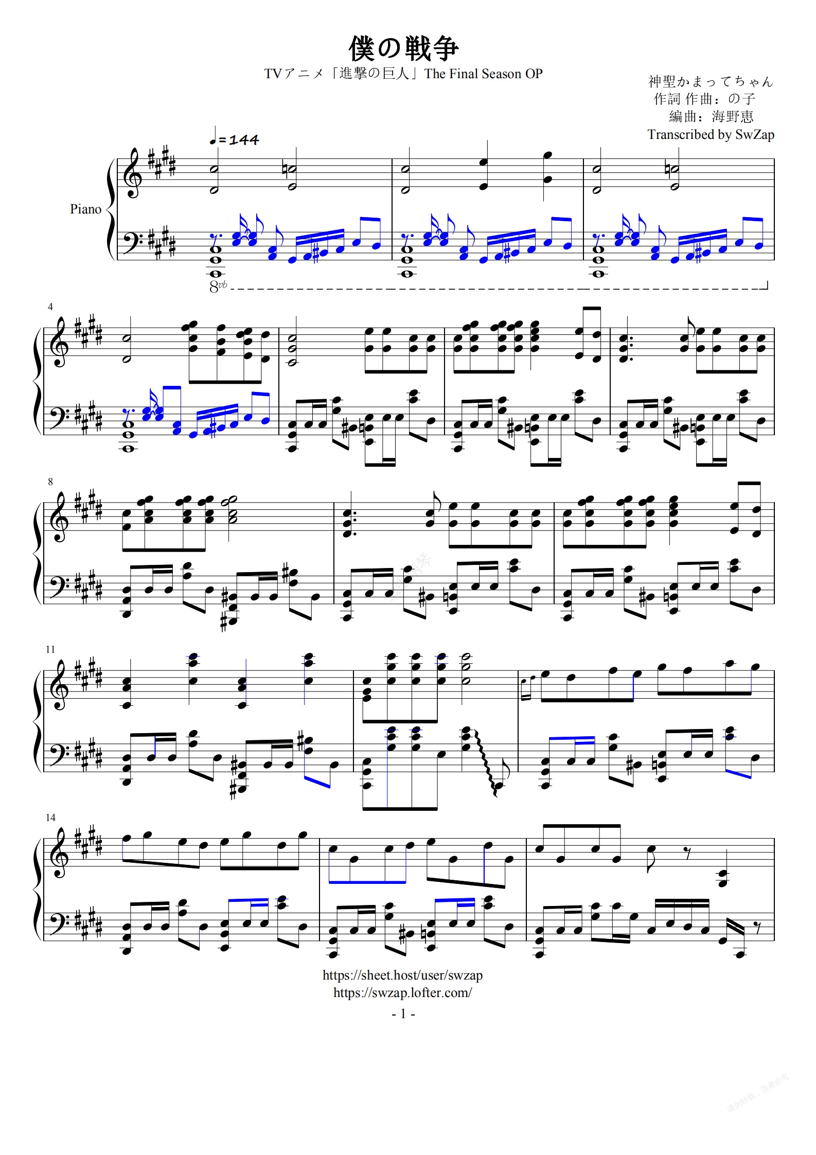 钢琴谱:《进击的巨人》最終章OP「僕の戦争」