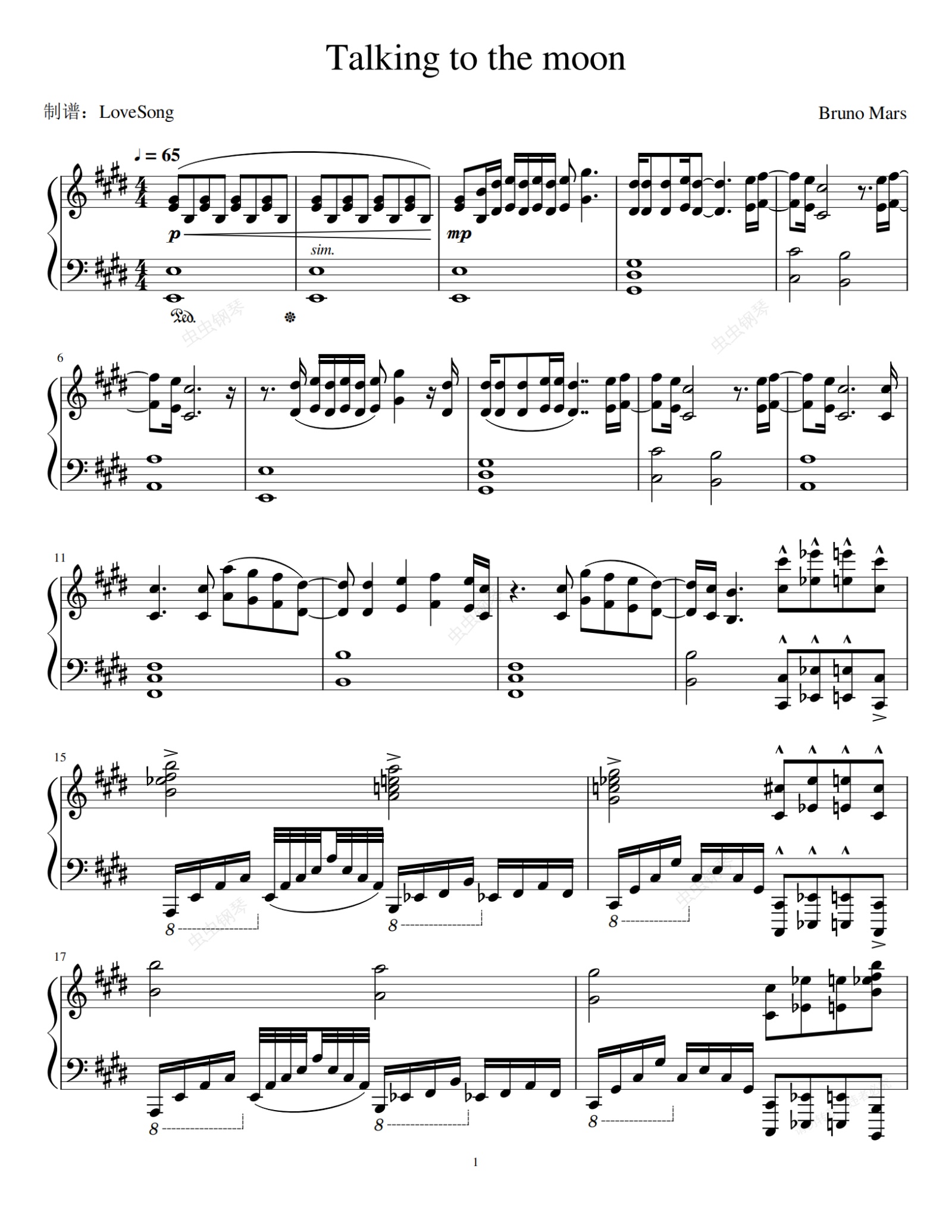 钢琴谱:Bruno Mars 火星哥 talking to the moon 钢琴谱原版