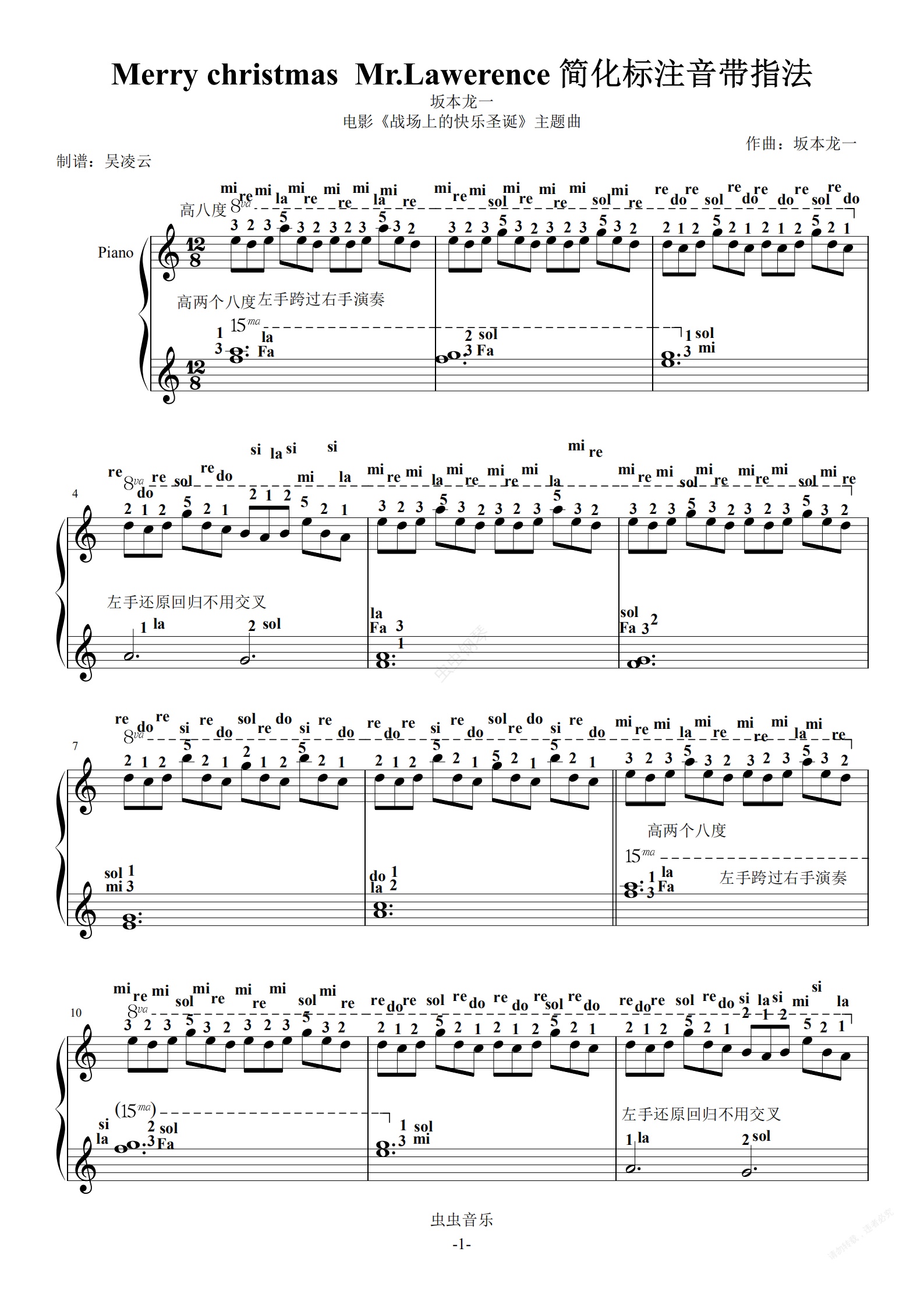 钢琴谱:Merry christmas Mr.Lawerence 坂本龙一 简化标注音带指法 电影《战场上的快乐圣诞》主题曲 吴凌云钢琴独奏版