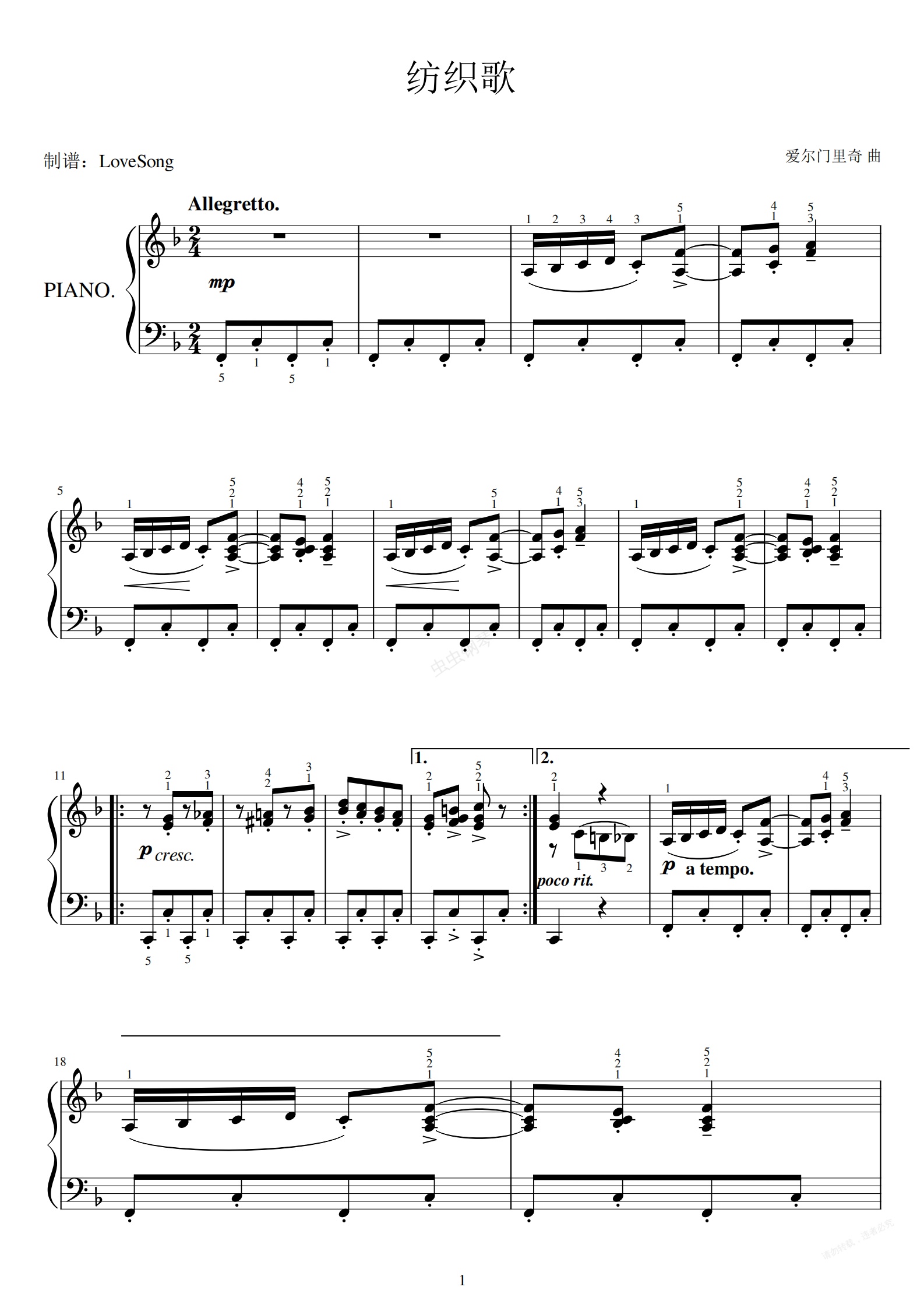 钢琴谱:爱尔门里奇 纺织歌钢琴谱带指法