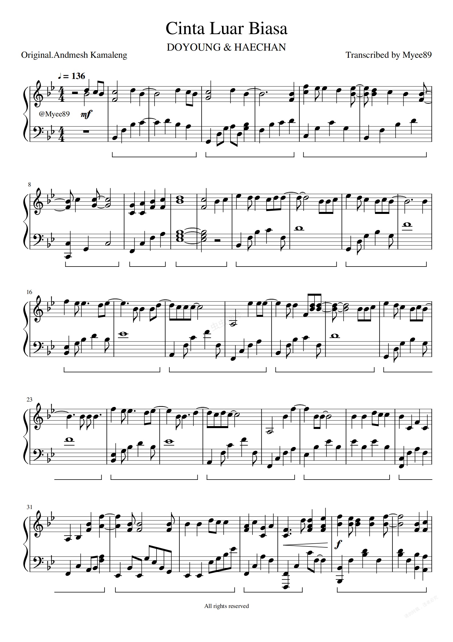 钢琴谱:道英 & 楷灿 - Cinta Luar Biasa 【非凡的爱】(原唱.Andmesh Kamaleng) 钢琴谱