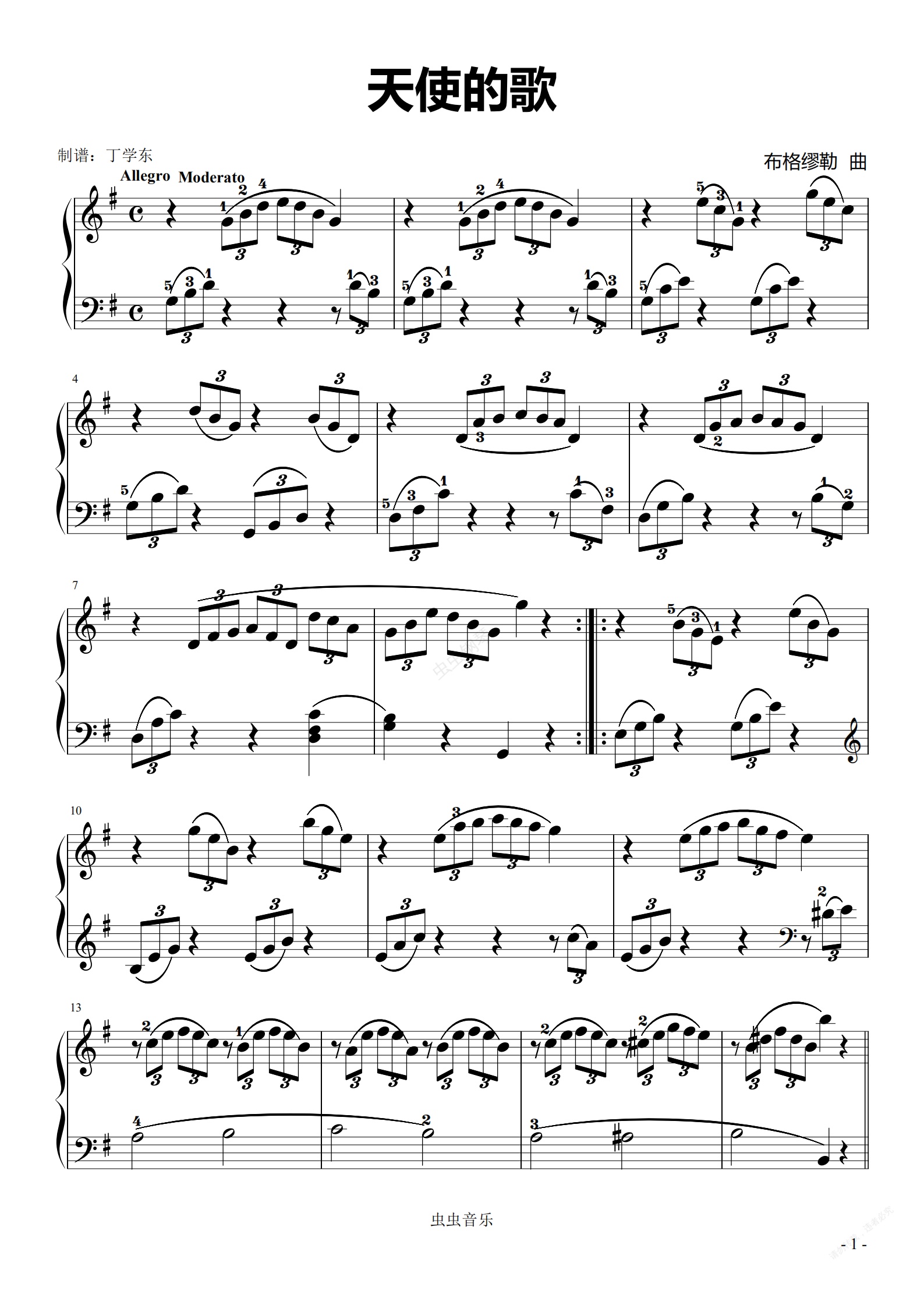 布格缪勒1806年12月4日生于德国巴伐利亚省的勒根斯堡,1874年2月10日卒于法国塞纳-瓦兹区的波尔那村。德国作曲家、钢琴家。他擅长为青少年学琴者创作钢琴小曲和练习曲。《布格缪勒钢琴进阶练习25首(作品100)》是他的作品第100号,有25首练习曲,都是兼具技术性和趣味性的小曲。《天使的歌声》就是其中的第21首。乐曲为三段式:A、B、A、加尾声。全曲以琶音来写的,所以要尽力使它发出优美的音响,悦耳和谐地象天使在唱歌。演奏时,双手琶音要配合自然、无隙,旋律起伏、流畅。连音要圆滑,在乐曲的最高音上防止加重音,踏板要柔和。