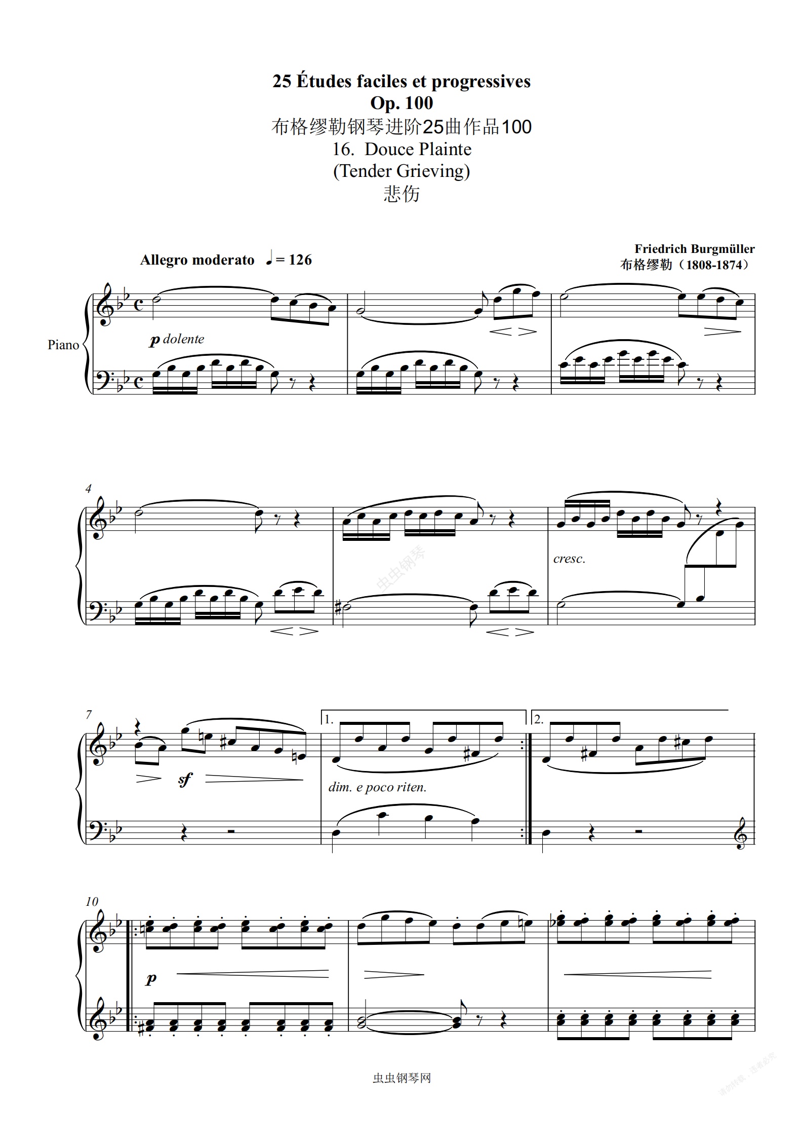 钢琴谱:【初学者】第16首 悲伤-布格缪勒25首钢琴进阶练习曲 Op. 100