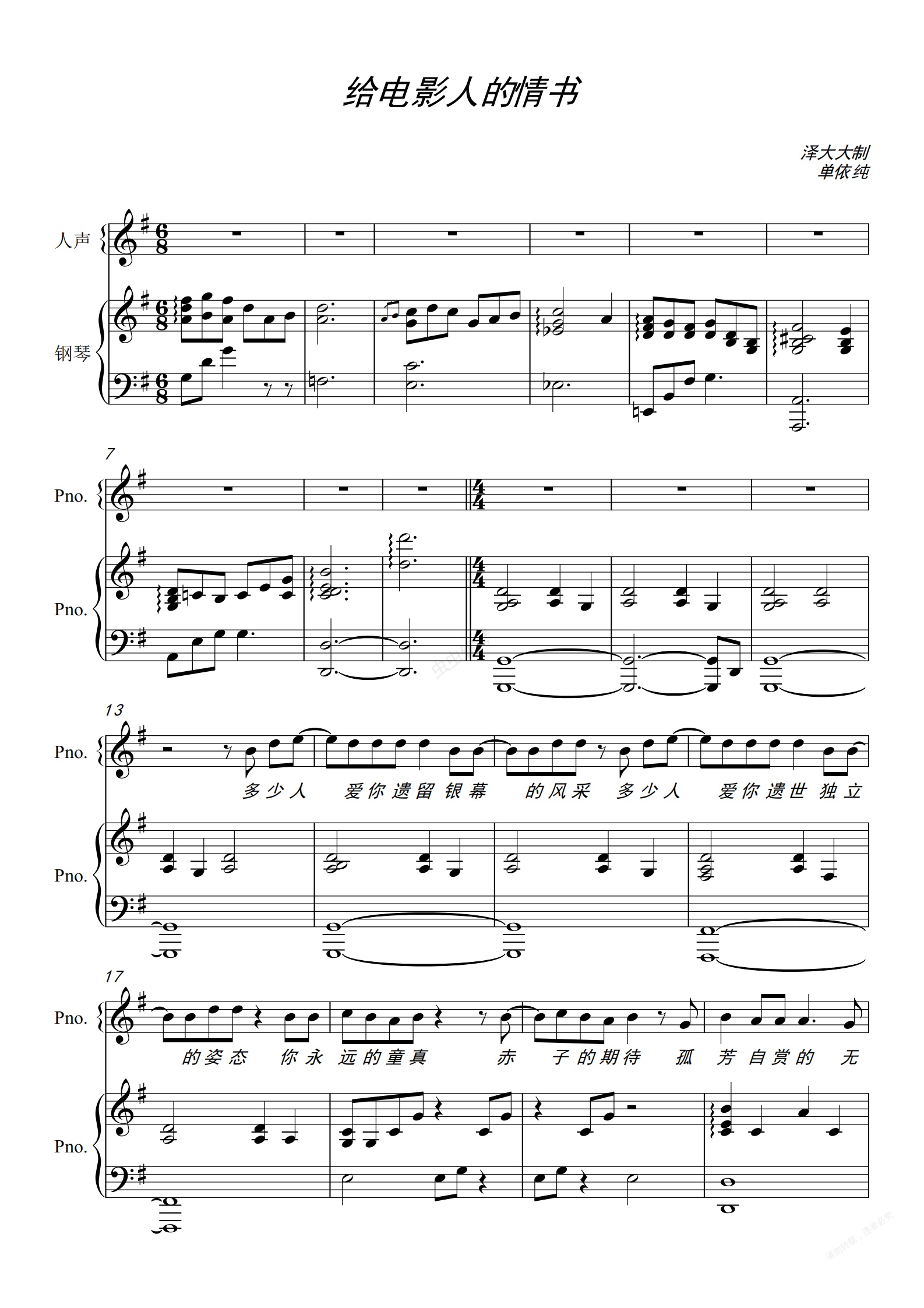 钢琴谱:给电影人的情书【完美伴奏弹唱附词】