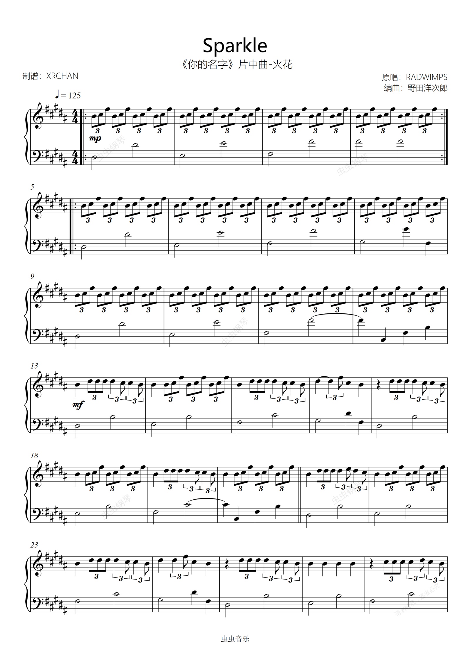 钢琴谱:你的名字-火花 Sparkle スパークル 9岁 初级版