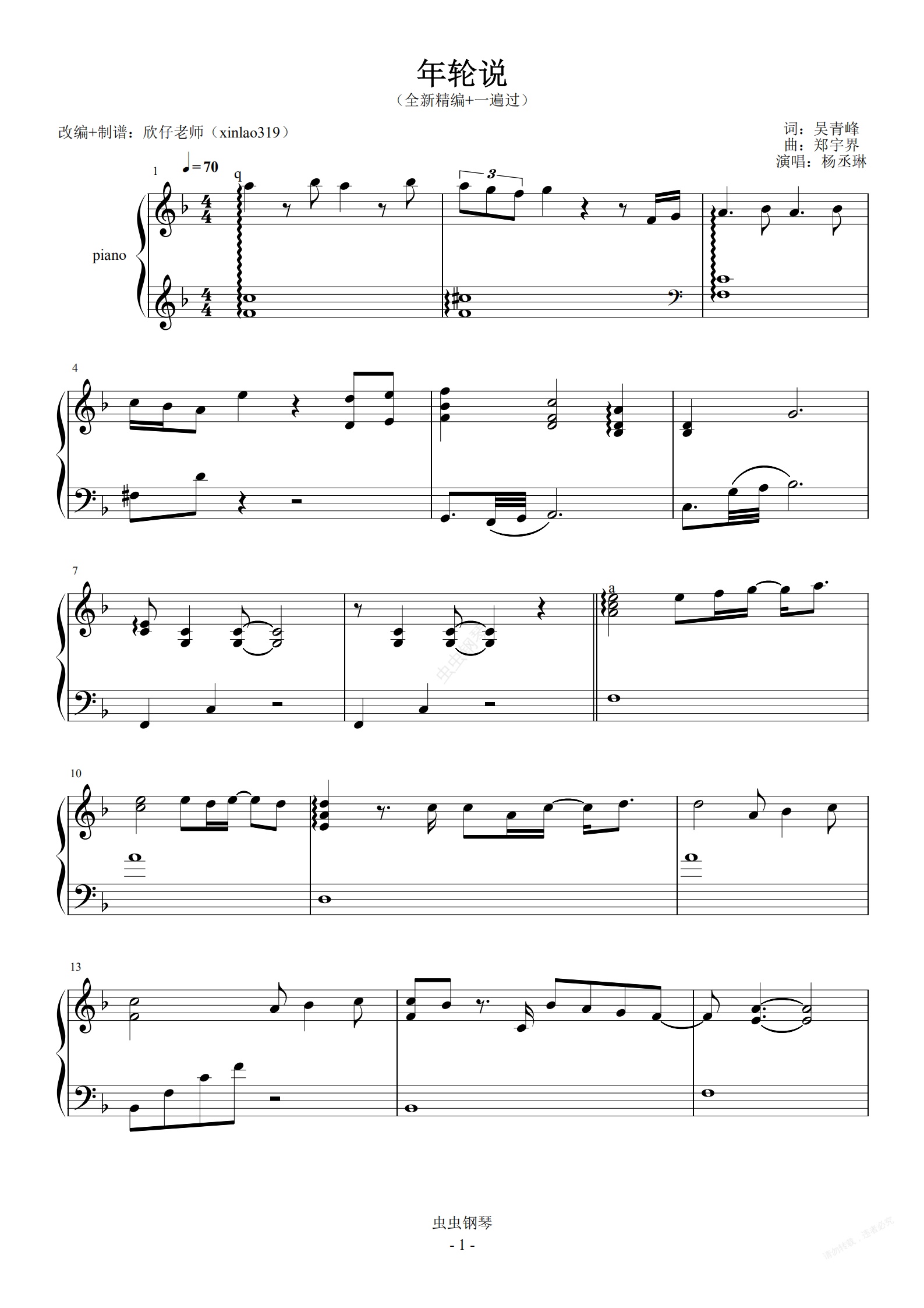 钢琴谱:杨丞琳-《年轮说》-F(难度适中版+全新精编+一遍过)