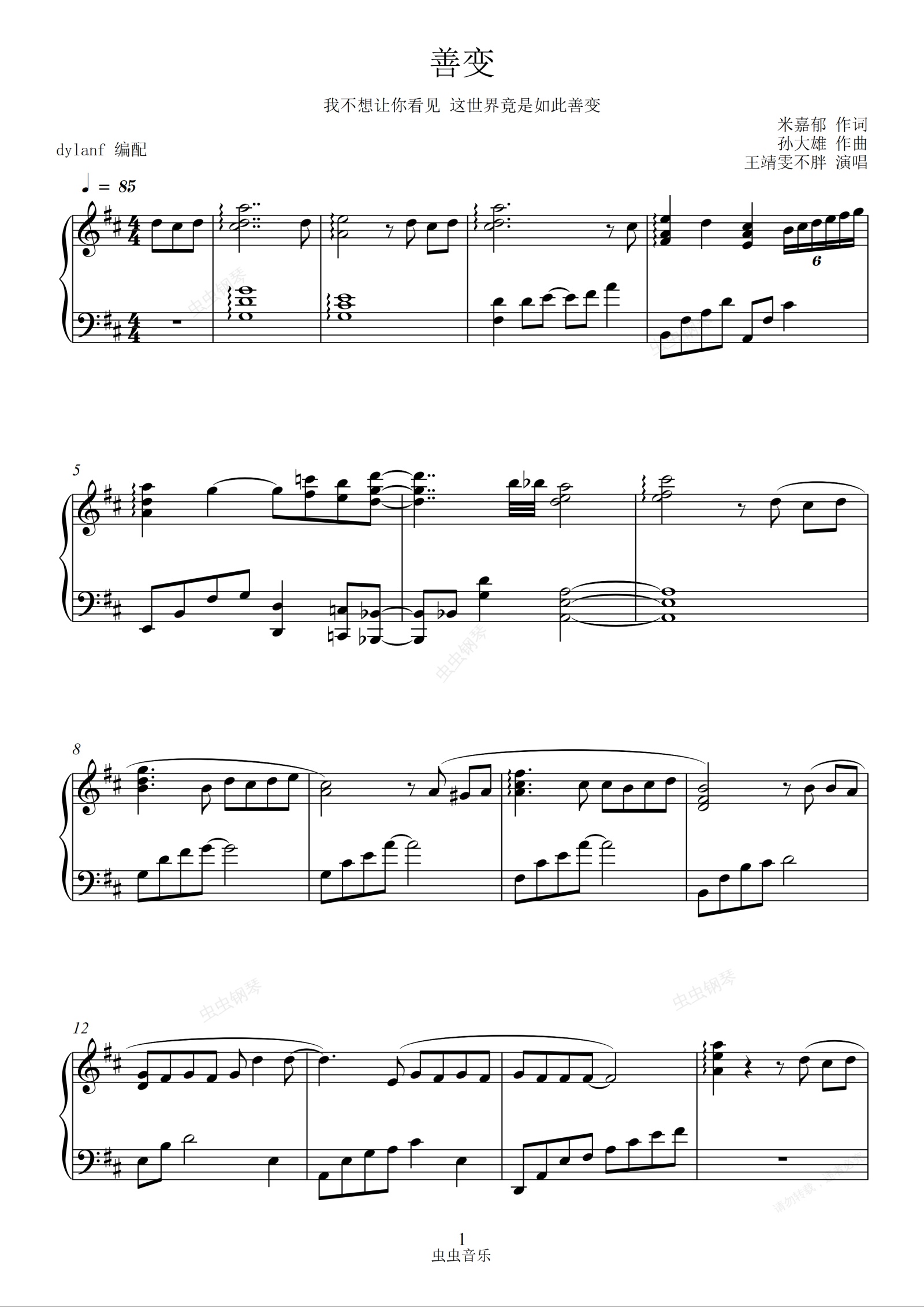 钢琴谱:善变 王靖雯不胖 好听原调