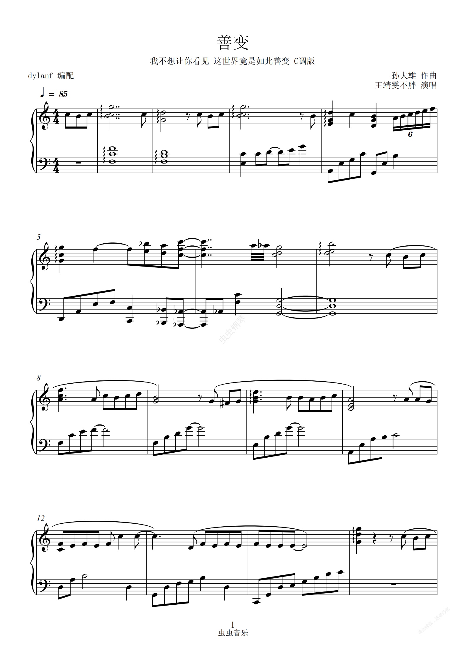 钢琴谱:C调易弹 善变 王靖雯不胖