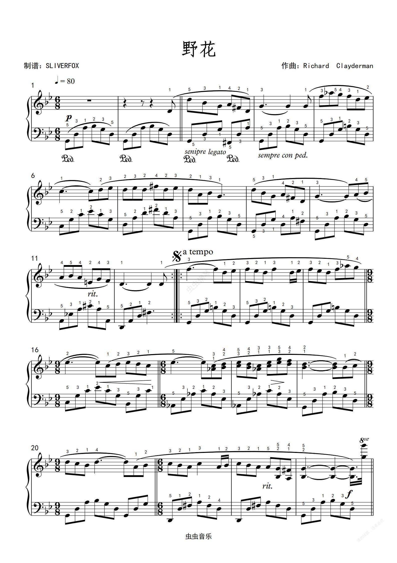 钢琴谱:野花 初级指法版 理查德克莱德曼