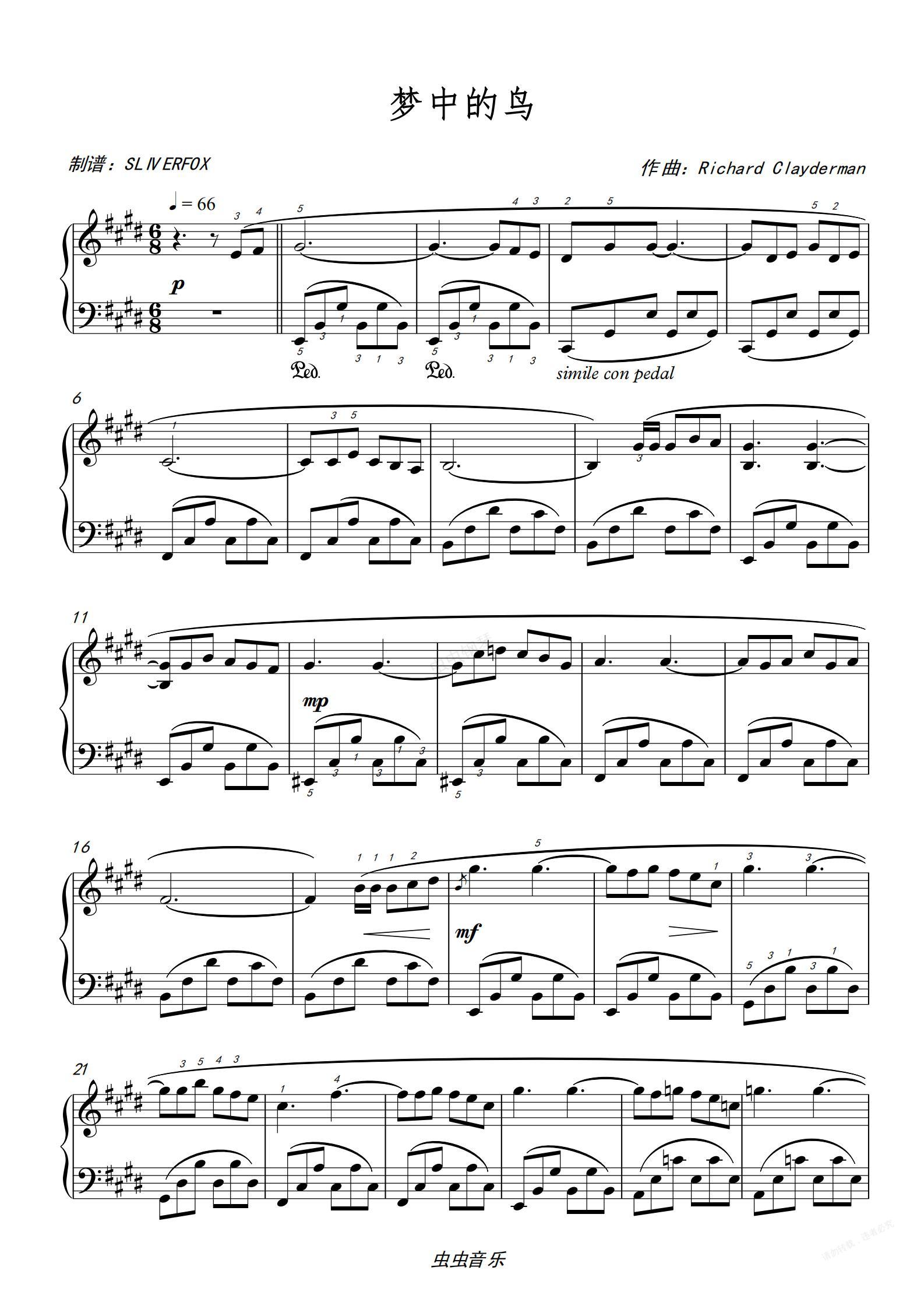钢琴谱:梦中的鸟 理查德克莱德曼 轻音乐初级