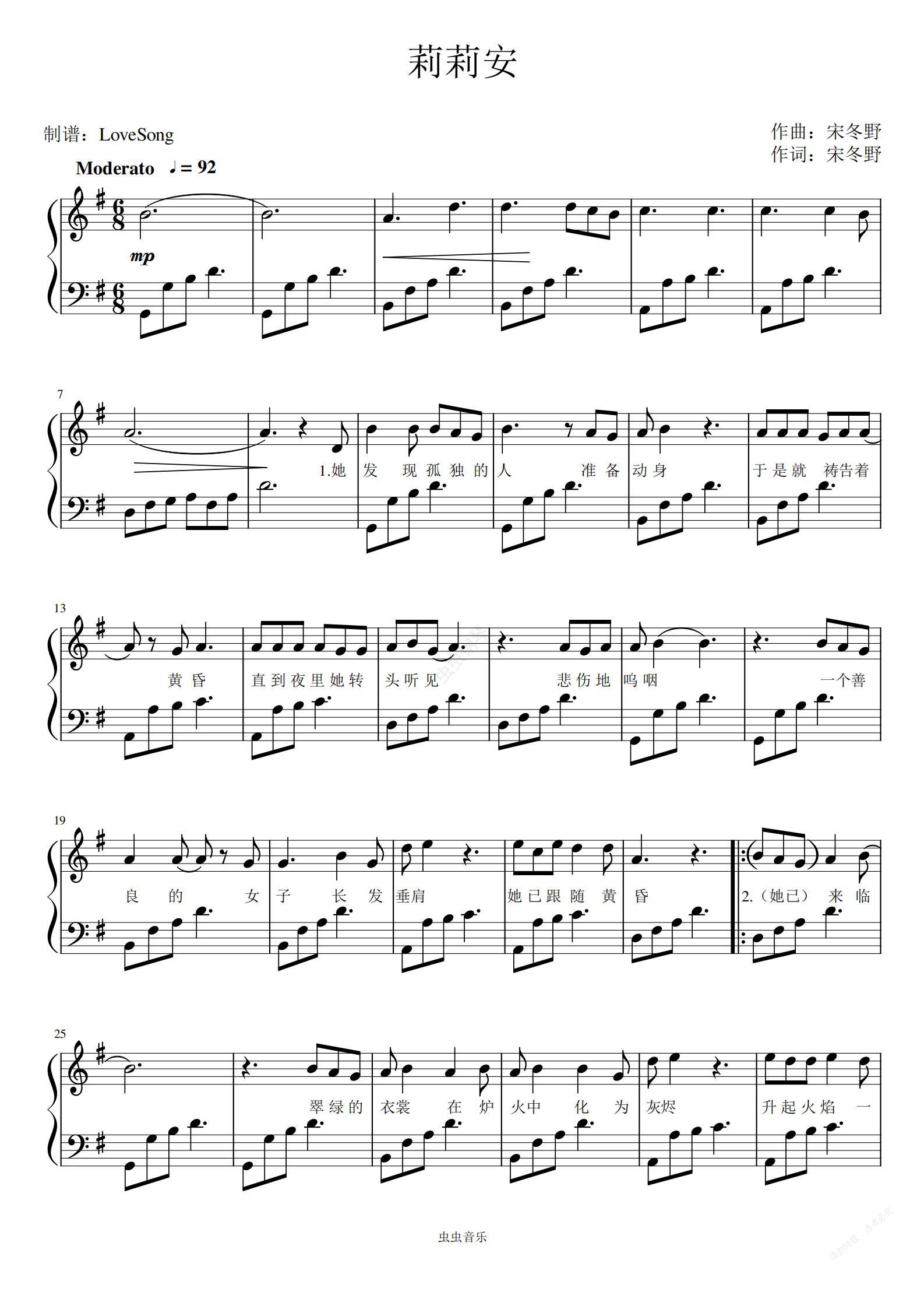 钢琴谱:宋冬野 莉莉安 钢琴谱 简单带歌词版