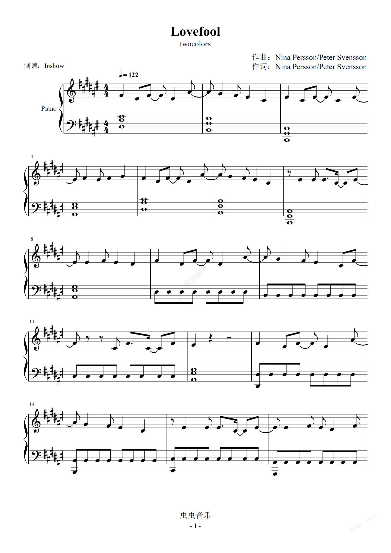 钢琴谱:Lovefool【独奏】- twocolors -