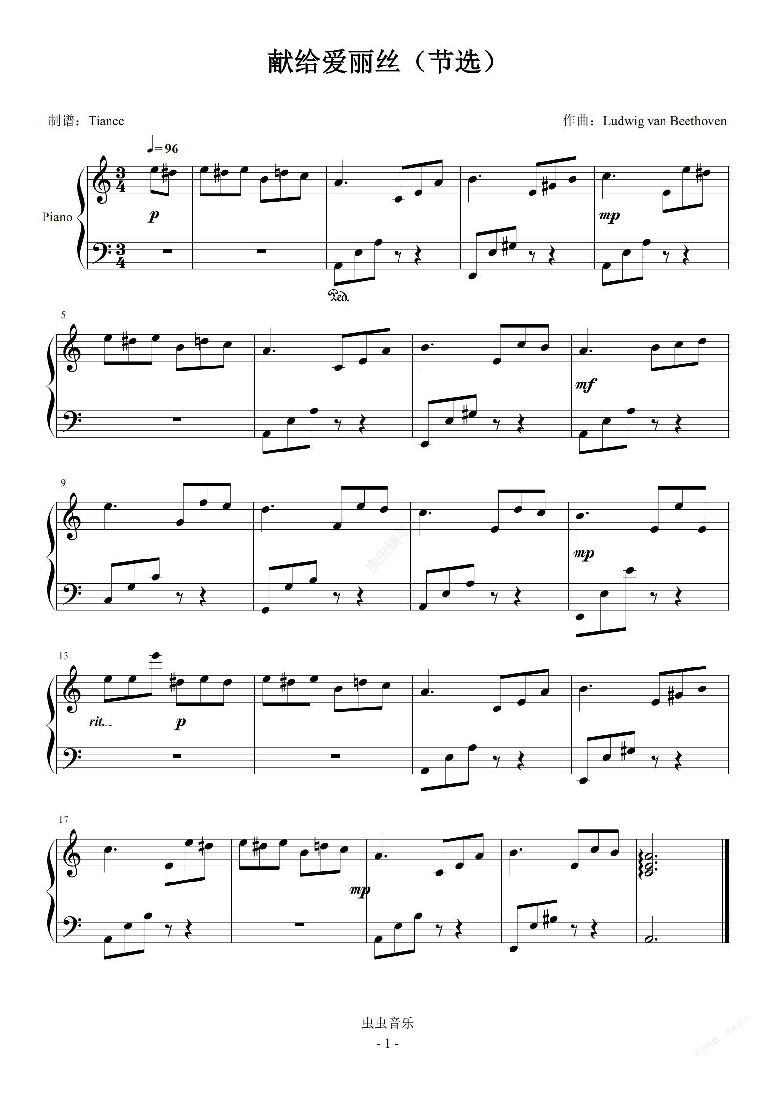 钢琴谱:《献给爱丽丝(节选)》拜厄难度,最耳熟能详的一段