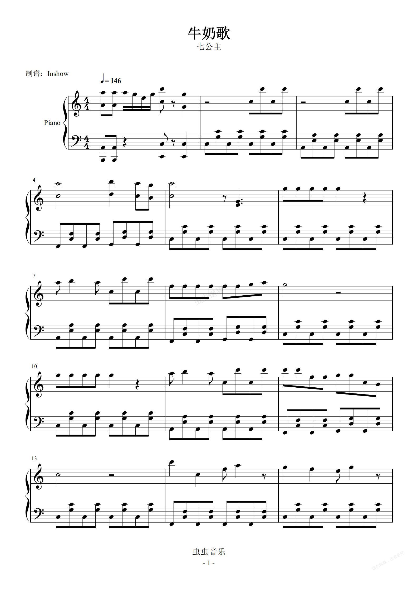 钢琴谱:牛奶歌(우유쏭)【独奏】- 七公主 -