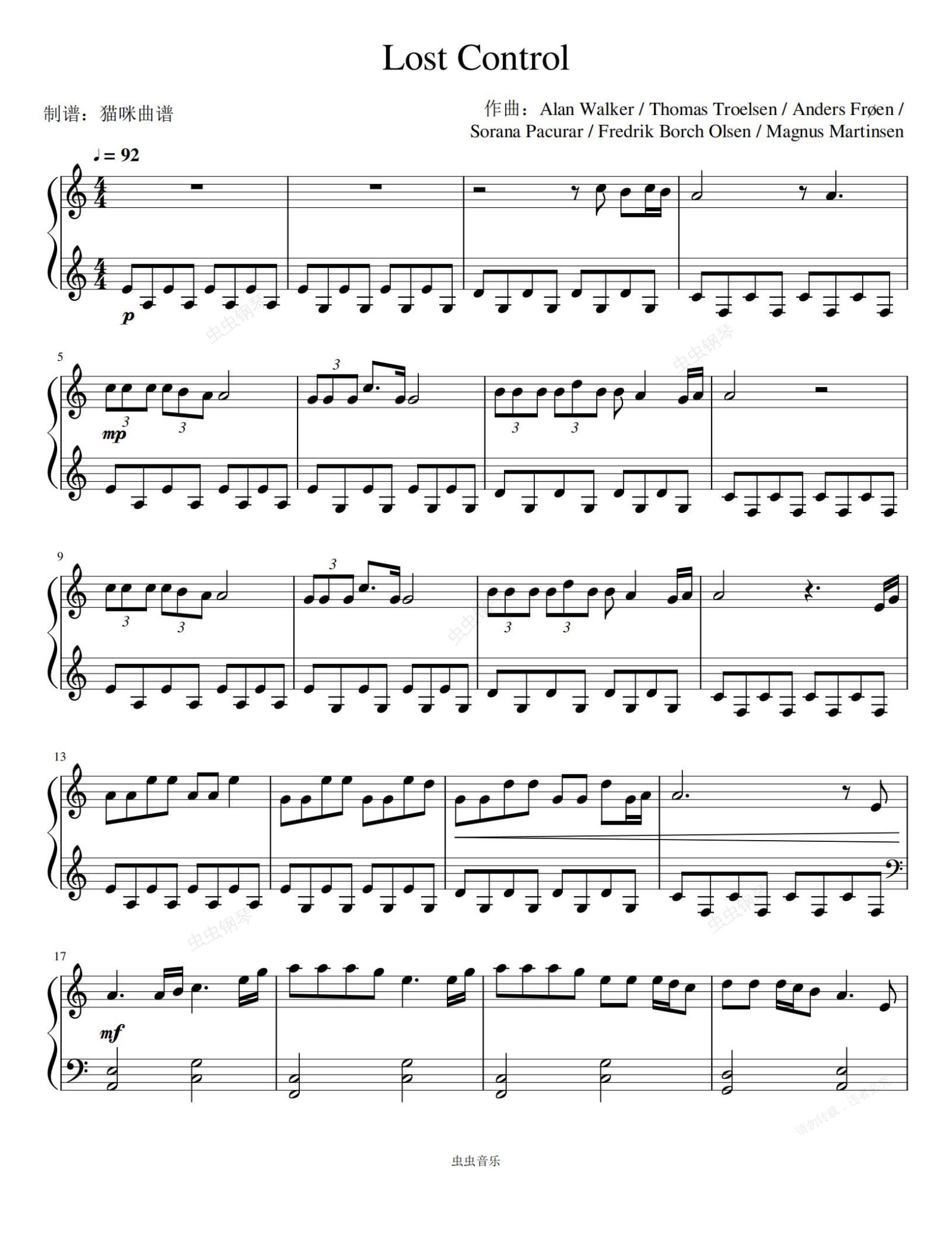 钢琴谱:Lost Controlc(C调)——Alan Walker