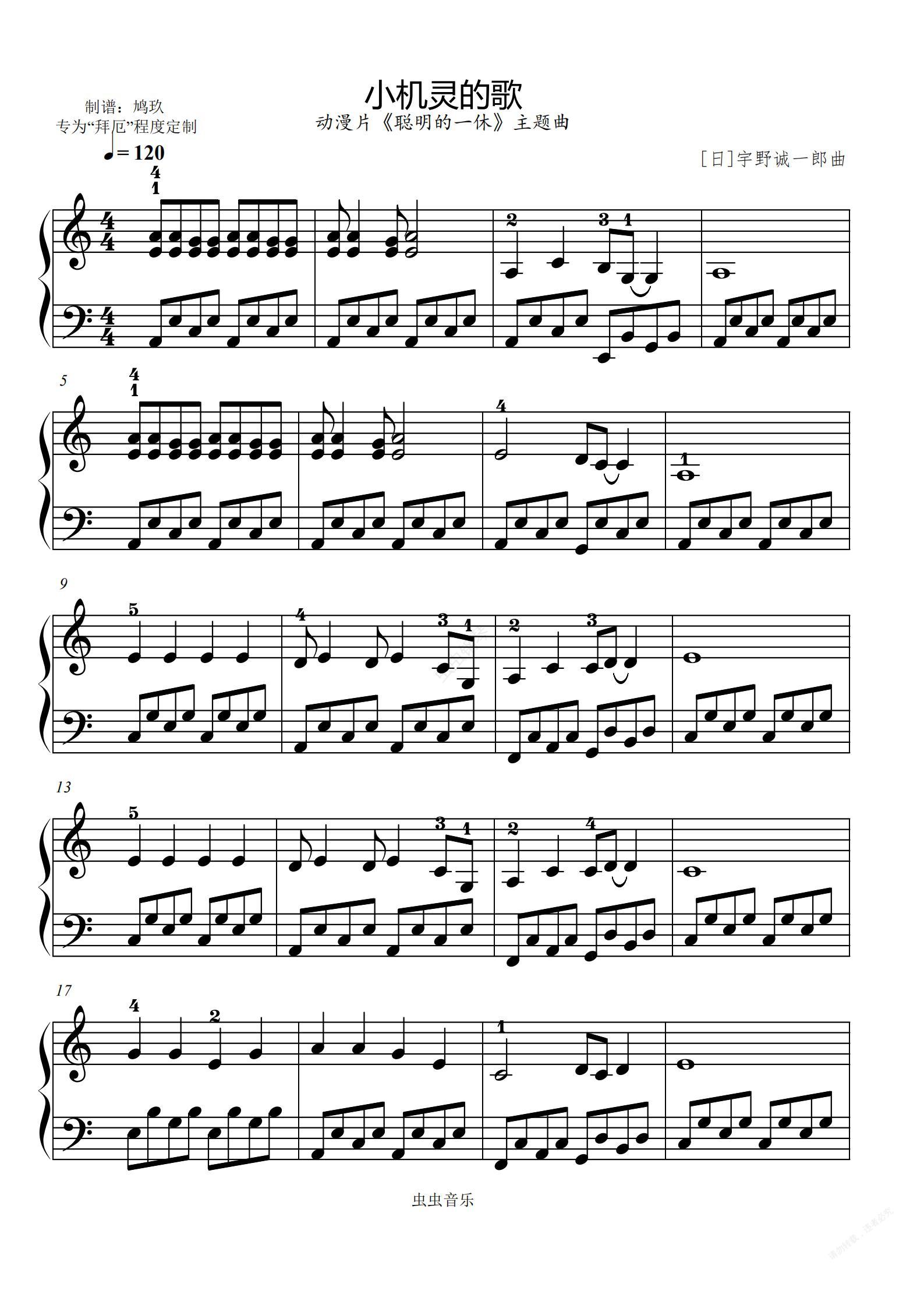 钢琴谱:小机灵的歌《聪明的一休》主题曲(拜厄程度)