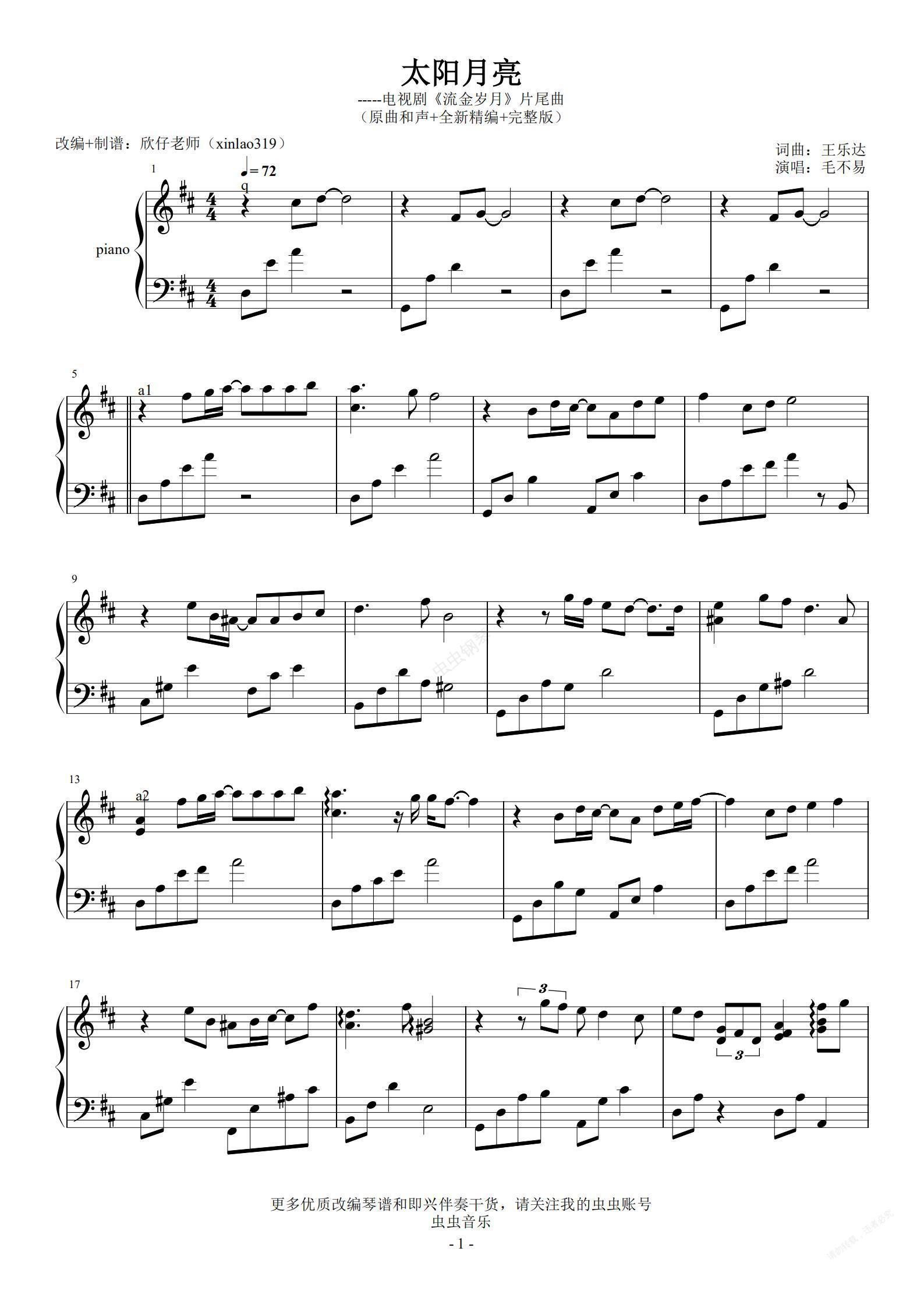 钢琴谱:D-毛不易-《太阳月亮》(电视剧《流金岁月》片尾曲)
