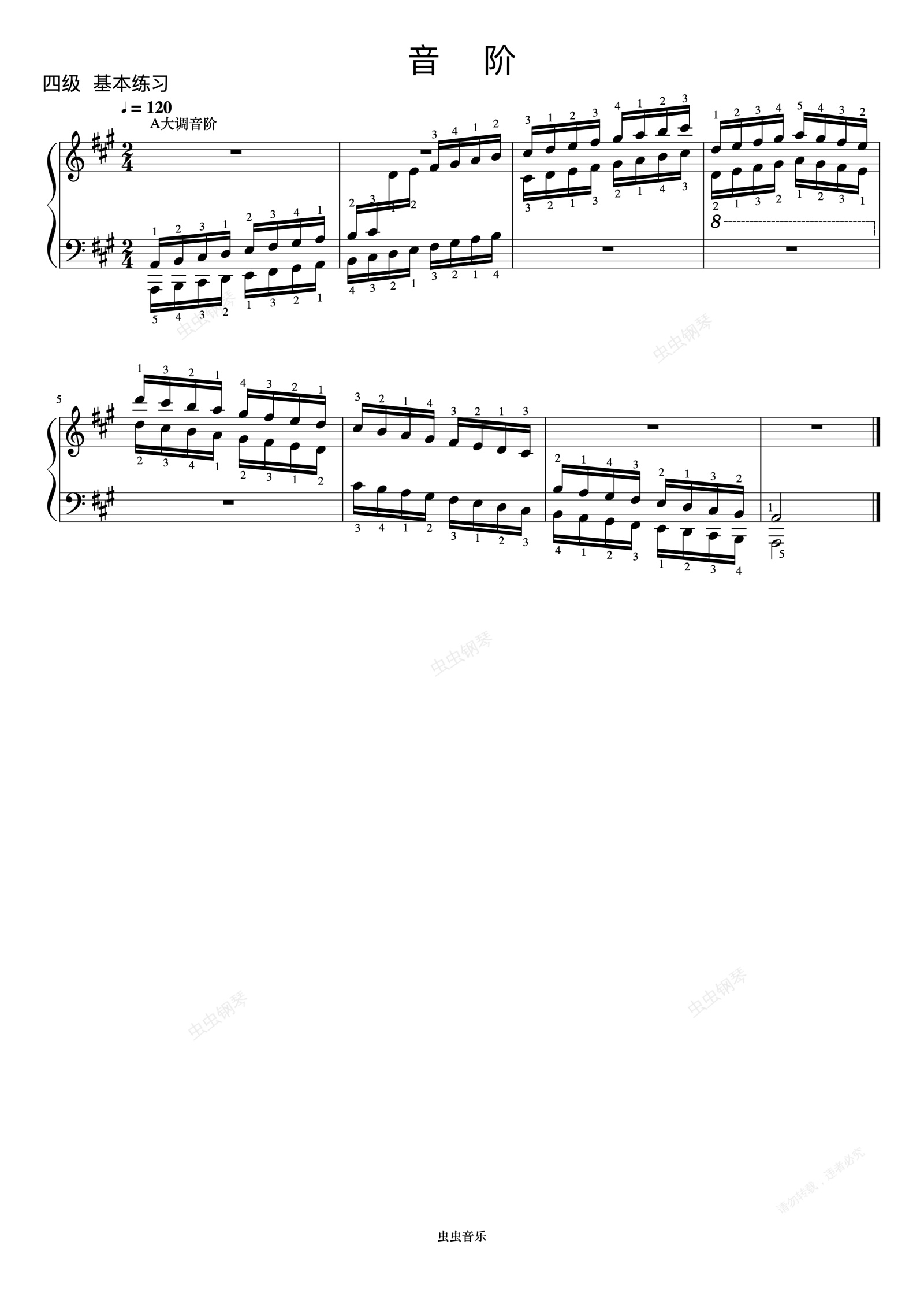 钢琴谱: A大调音阶《 ZYY 钢琴考级曲目 1》